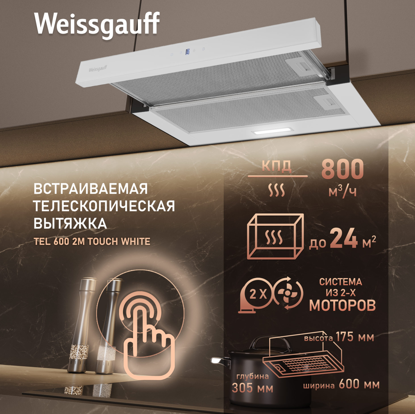 Встраиваемая в верхний подвесной шкаф двухмоторная телескопическая вытяжка оснащенная сенсорной панелью управления Touch Control, разработанная компанией Weissgauff, представляет собой инновационное решение в области кухонного оборудования. Данная модель, отличающаяся высокой производительностью в 800 м³/ч, демонстрирует выдающуюся эффективность в очистке воздуха и поддержании оптимального микроклимата в кухонном пространстве!