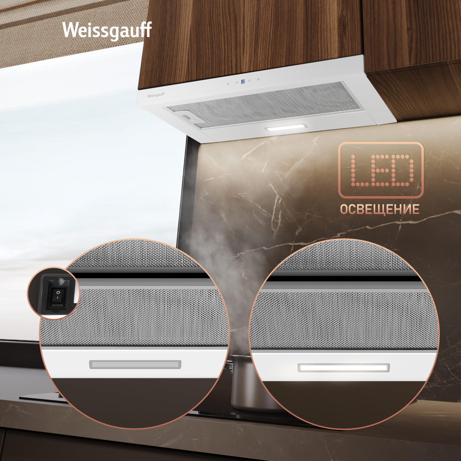 Эффективная система из двух моторов делает данное устройство самой производительной вытяжкой в линейке телескопических моделей Weissgauff!