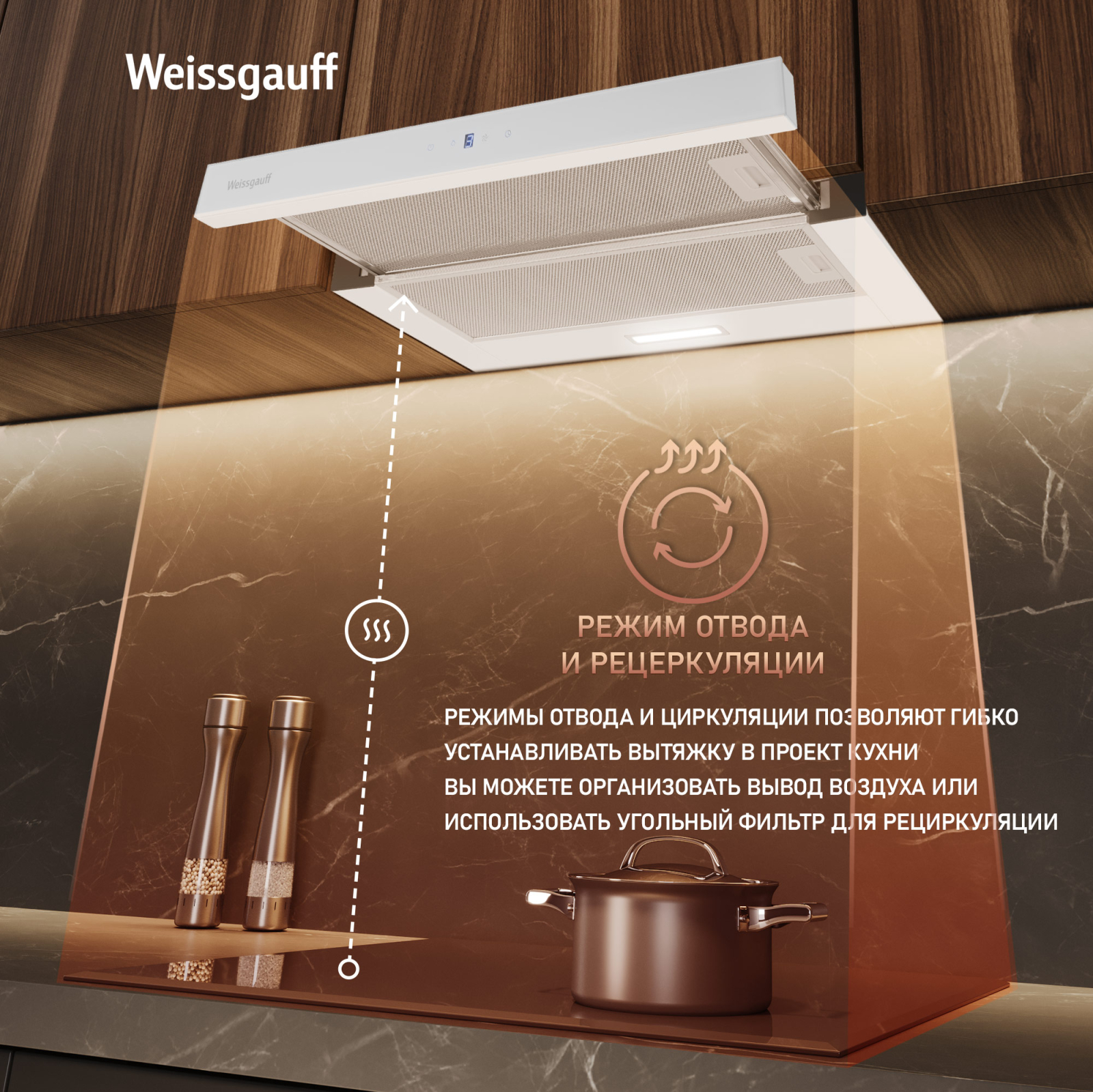 Работа в режимах отвода и циркуляции откроет вам широкие возможности по установке этой вытяжки в проект вашей кухни. Организуйте полноценный вывод воздуха из помещения или установите угольный фильтр и используйте вытяжку вместе с ним - какой бы вариант вы ни выбрали, модель от Weissgauff сделает это возможным!