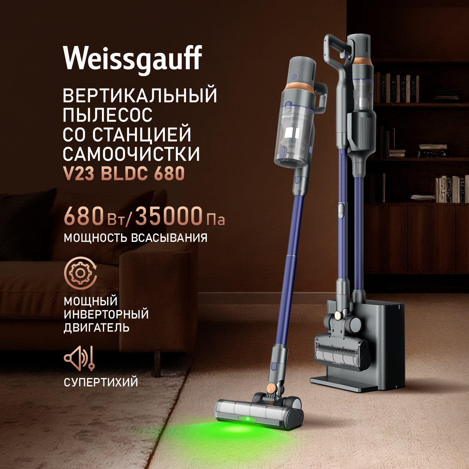 Weissgauff представляет Вашему вниманию новый сверхмощный вертикальный пылесос с циклонной системой фильтрации – которая эффективно разделяет загрязнённый воздух на мусор и очищенный воздушный поток, а также оснащенный станцией самоочистки Dust Station! Более того, он управляется с этим без мешка для сбора пыли. Оснащенный специальной турбощеткой для паркета и ламината с лазерной подсветкой зоны уборки, он эффективно удаляет пыль, не повреждая при этом поверхности пола. Инверторный двигатель нового поколения позволит ему справиться даже с самыми сложными загрязнениями! Удобная съемная рукоятка позволит использовать эту модель и как полноценный вертикальный пылесос, и как портативный независимый блок. А комплект дополнительных аксессуаров лишь дополнительно расширит возможности этого великолепного устройства!