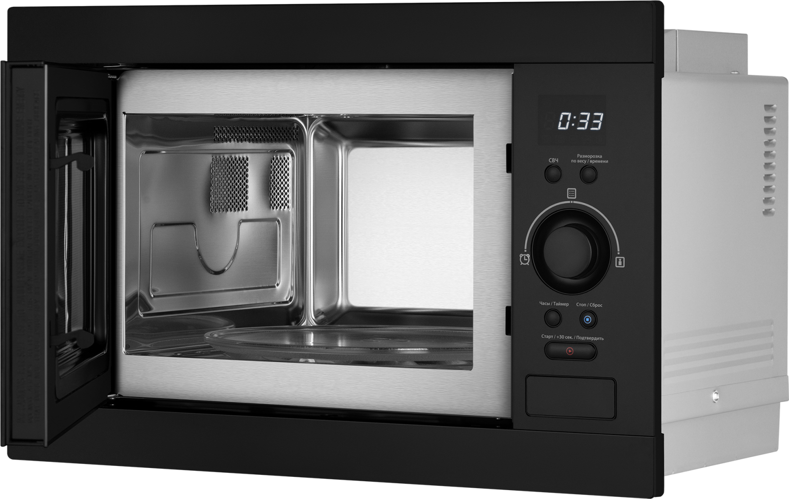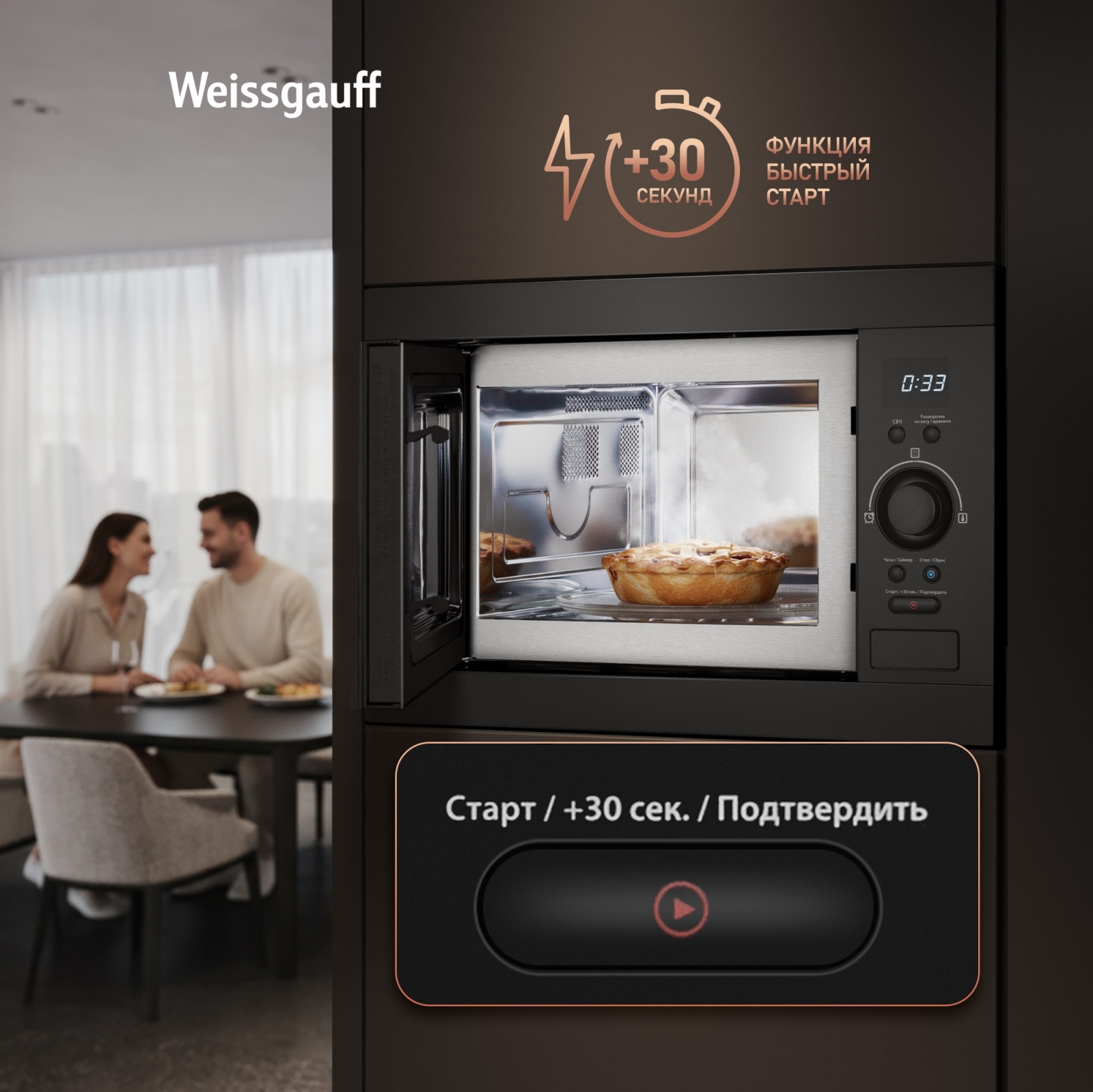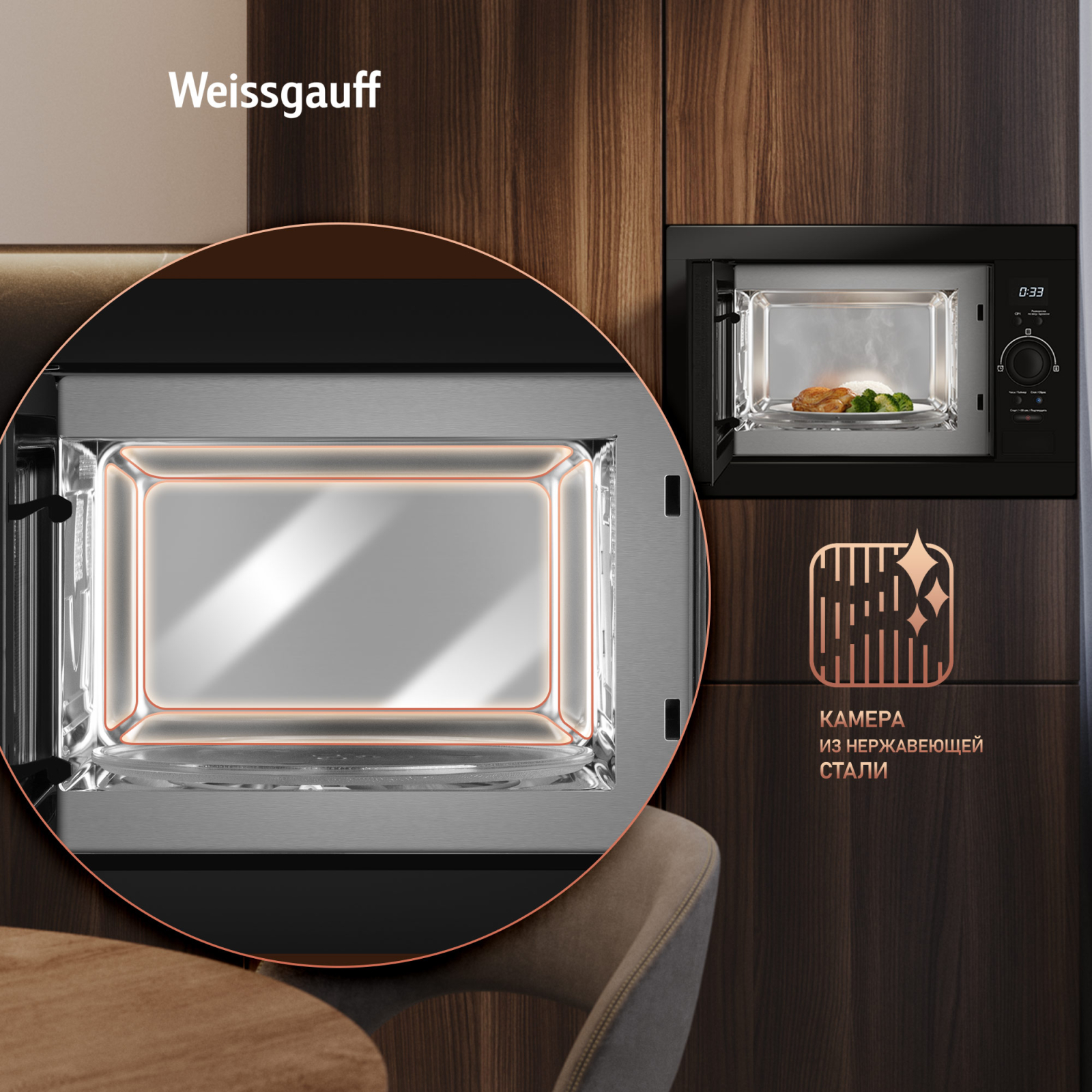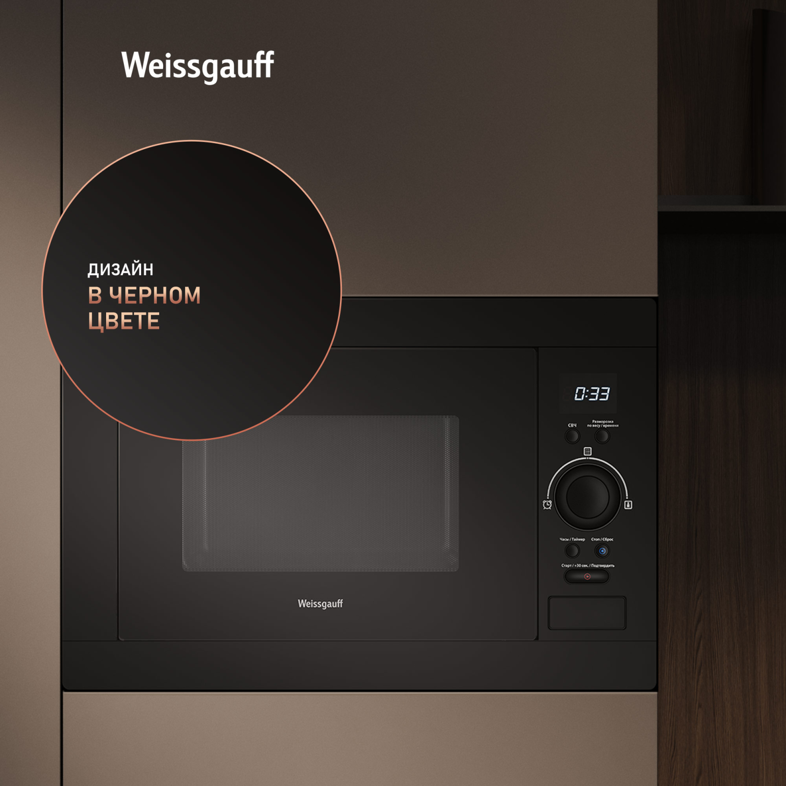 Встраиваемая микроволновая печь Weissgauff с объемом 25 литров, выполненная в черном цвете, равномерно разогревает еду при помощи поворотного стола, а также оснащена набором из 8 программ автоменю!