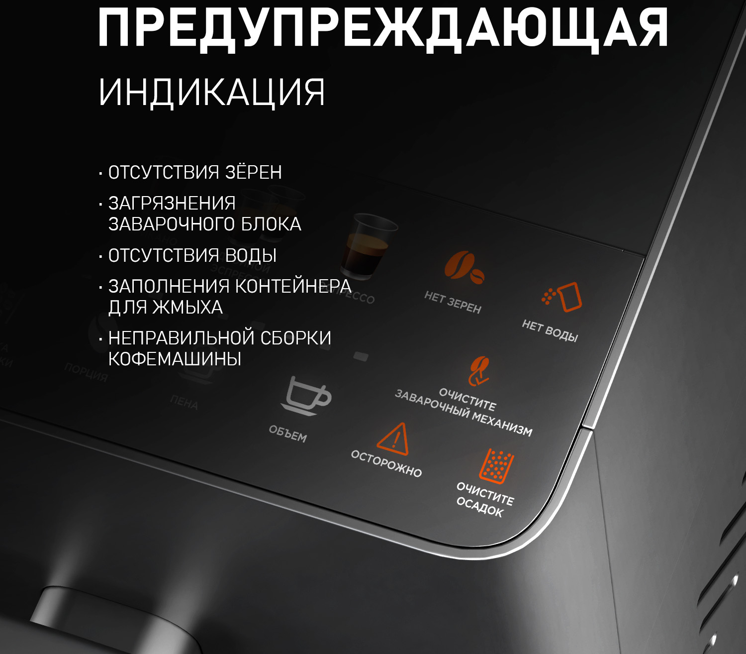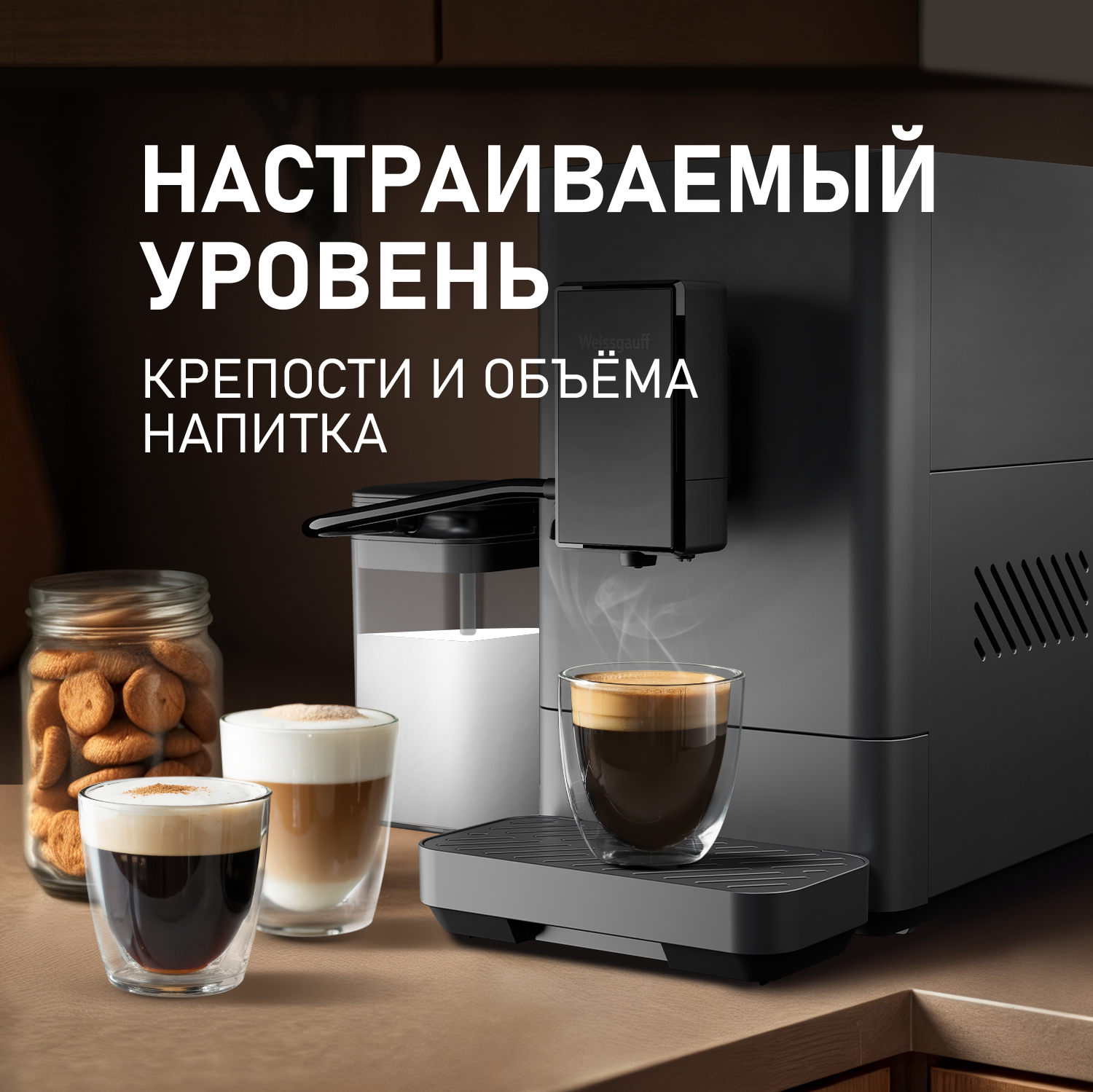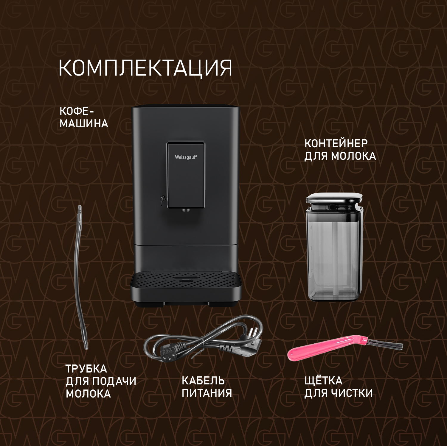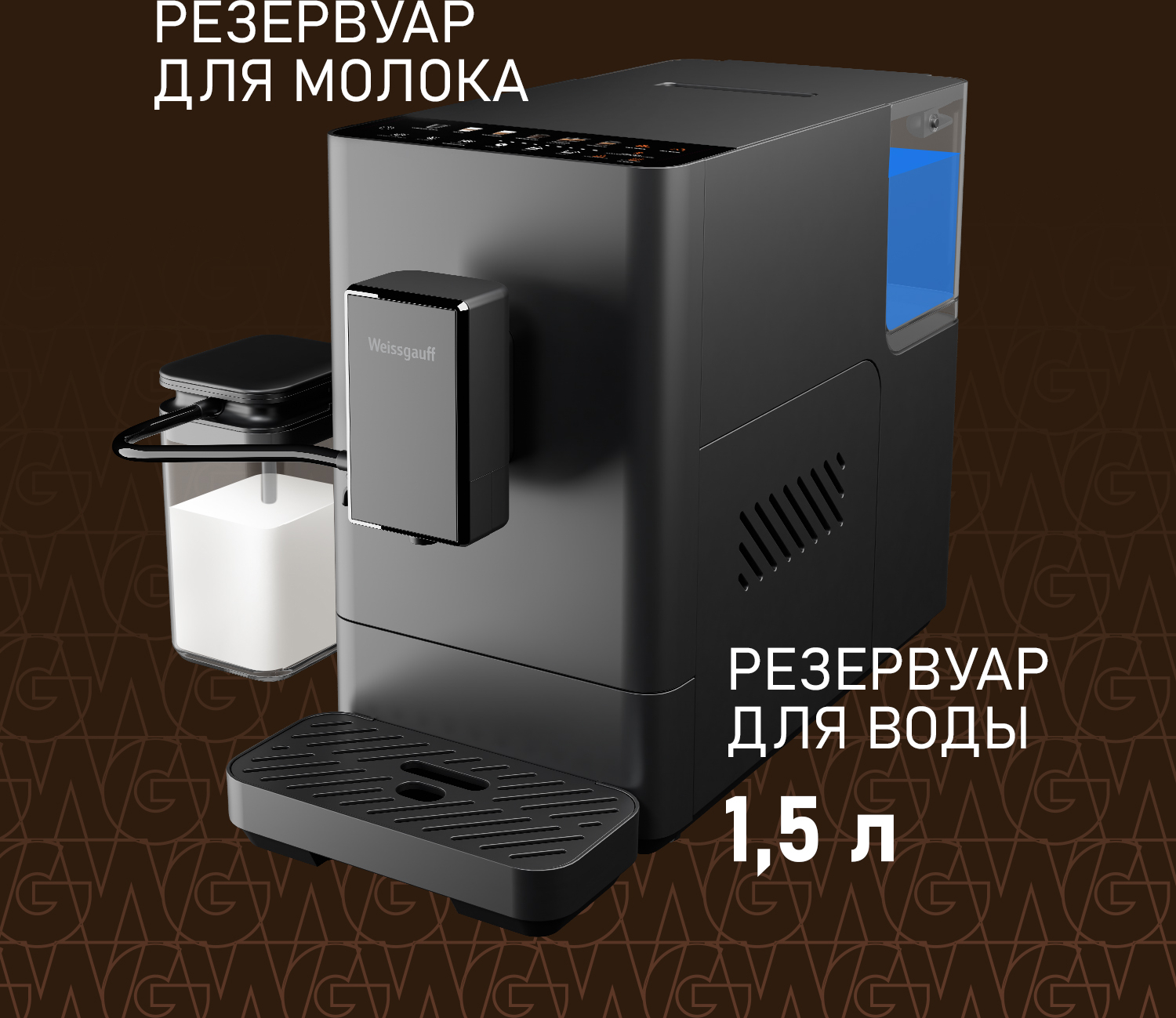 Кофемашина от Weissgauff, выполненная в черном цвете, оснащенная вместительным контейнером для зерен на 180 грамм, обладающая сенсорным управлением, системой подачи молока с автоматическим капучинатором, внешней емкостью для молока, а также 5 заранее предустановленными программами для приготовления ароматного вкуснейшего кофе прямо на вашей кухне!