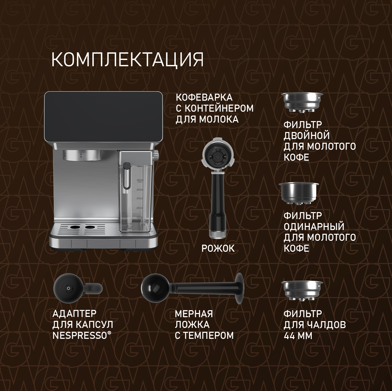 Кофеварка от Weissgauff, представленная в классическом черном цвете, оснащена цветным сенсорным экраном для управления и контроля процесса приготовления. Система подачи молока оборудована автоматическим капучинатором, а также внешней емкостью для молока объемом 500 мл, поддерживает приготовление кофе из чалд, капсул Nespresso и молотого кофе. Встроенные семь программ позволяют автоматизировать процесс создания ароматного и насыщенного напитка. Кофемашина предназначена для использования в домашних условиях и обеспечивает высокое качество приготовленного кофе.