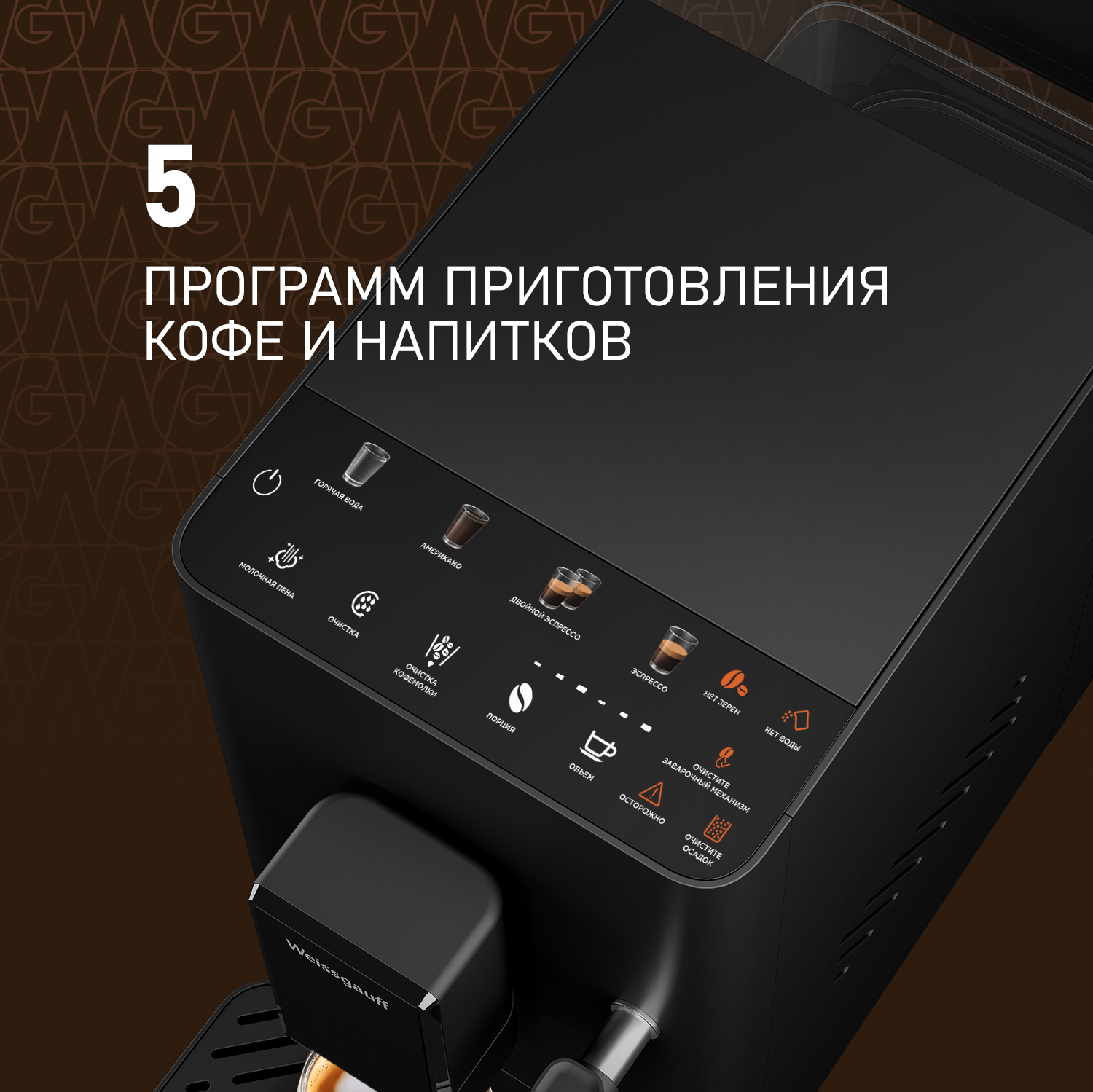 Кофемашина от Weissgauff, выполненная в черном цвете, оснащенная вместительным контейнером для зерен на 180 грамм, обладающая сенсорным управлением, капучинатором а также 5 заранее предустановленными программами для приготовления ароматного вкуснейшего кофе прямо на вашей кухне!