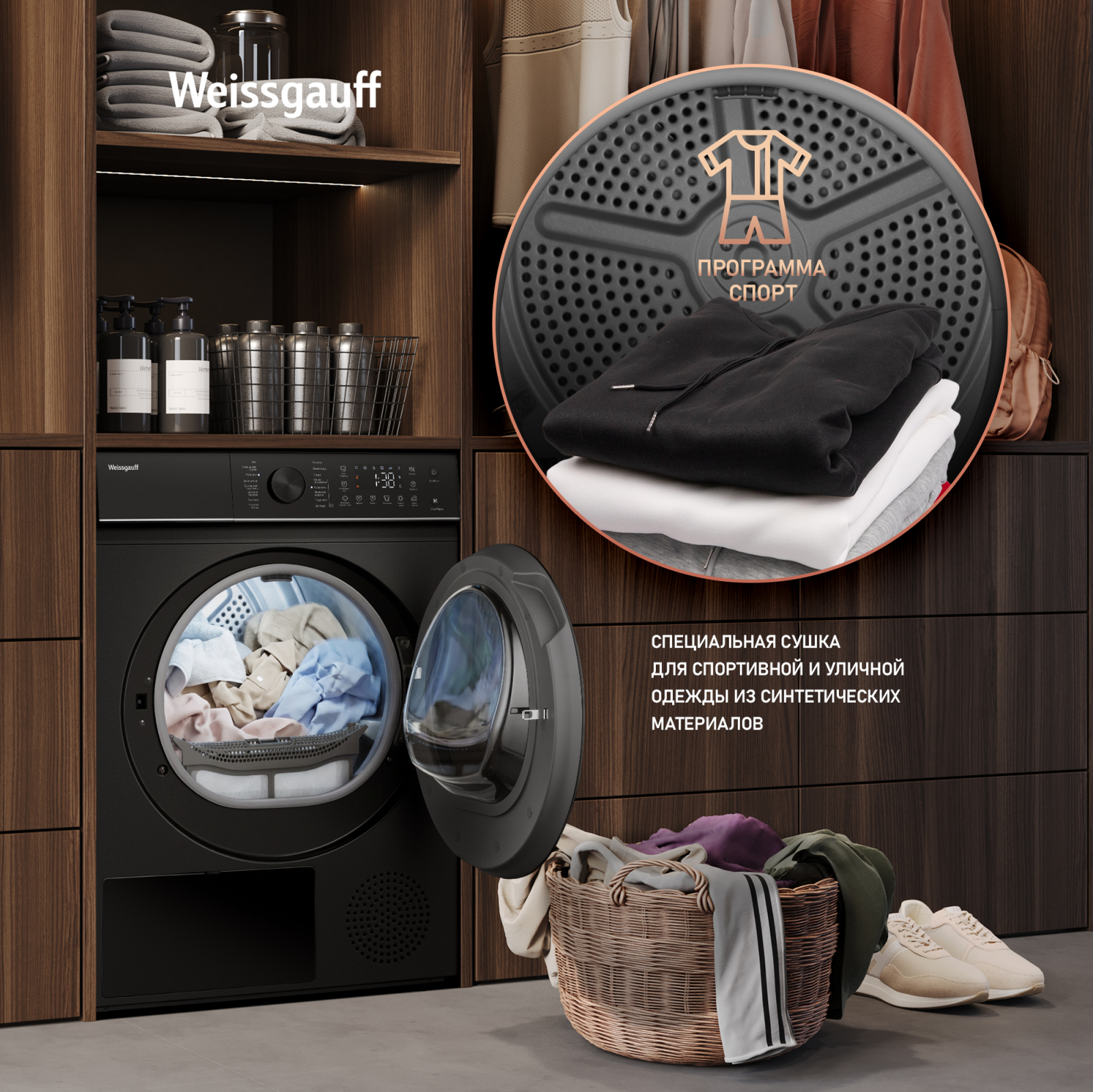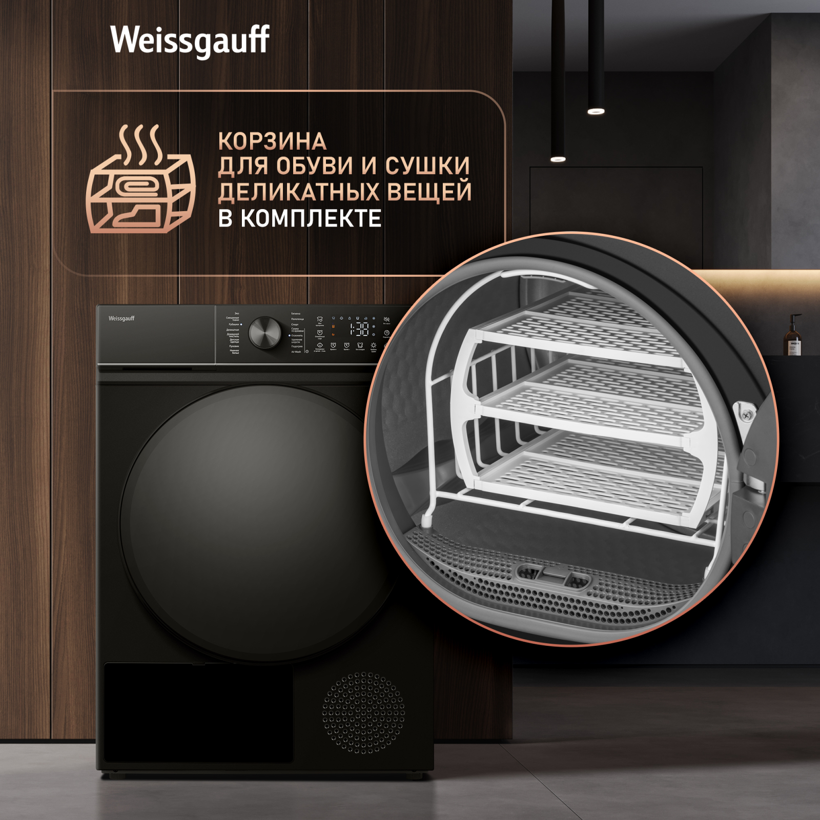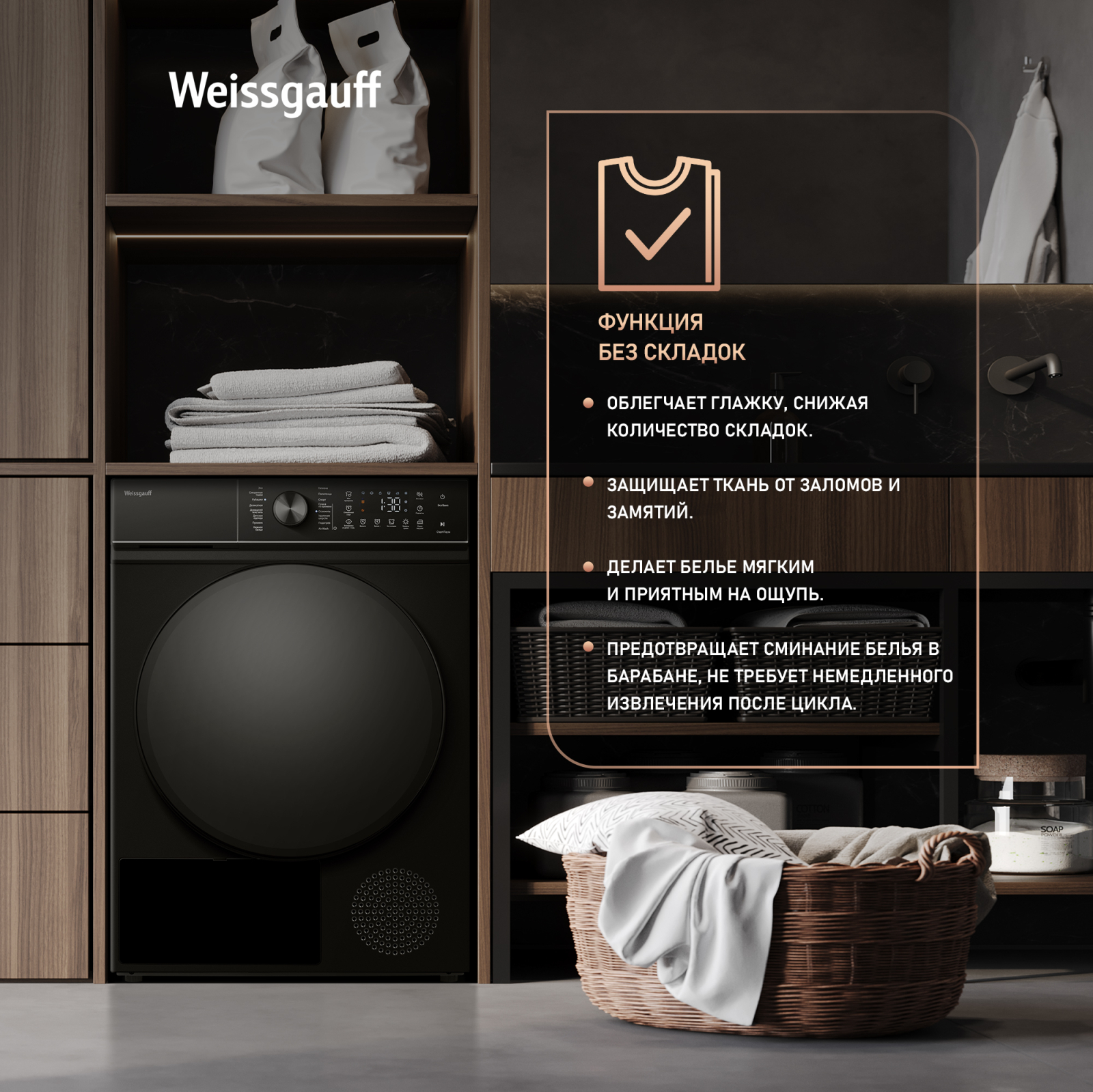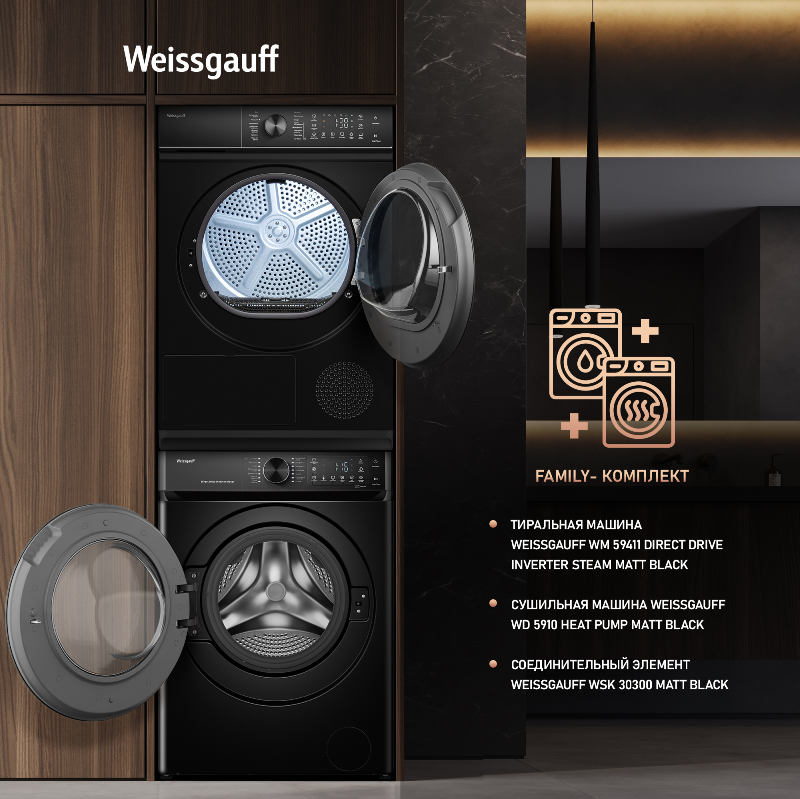 FAMILY- комплект! Данная модель идеальна для установки в колонну со стиральной машиной Weissgauff WM 59411 Direct Drive Inverter Steam Matt Black, образуя цельный и гармоничный комплект бытовой техники, выполненный в едином дизайне! Обратите внимание, что для установки в колонну потребуется дополнительно приобрести Соединительный элемент Weissgauff WSK 30300 Matt Black