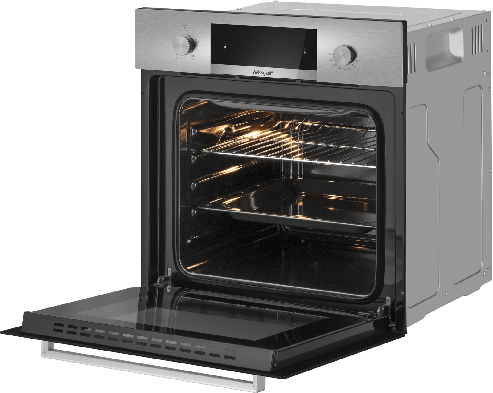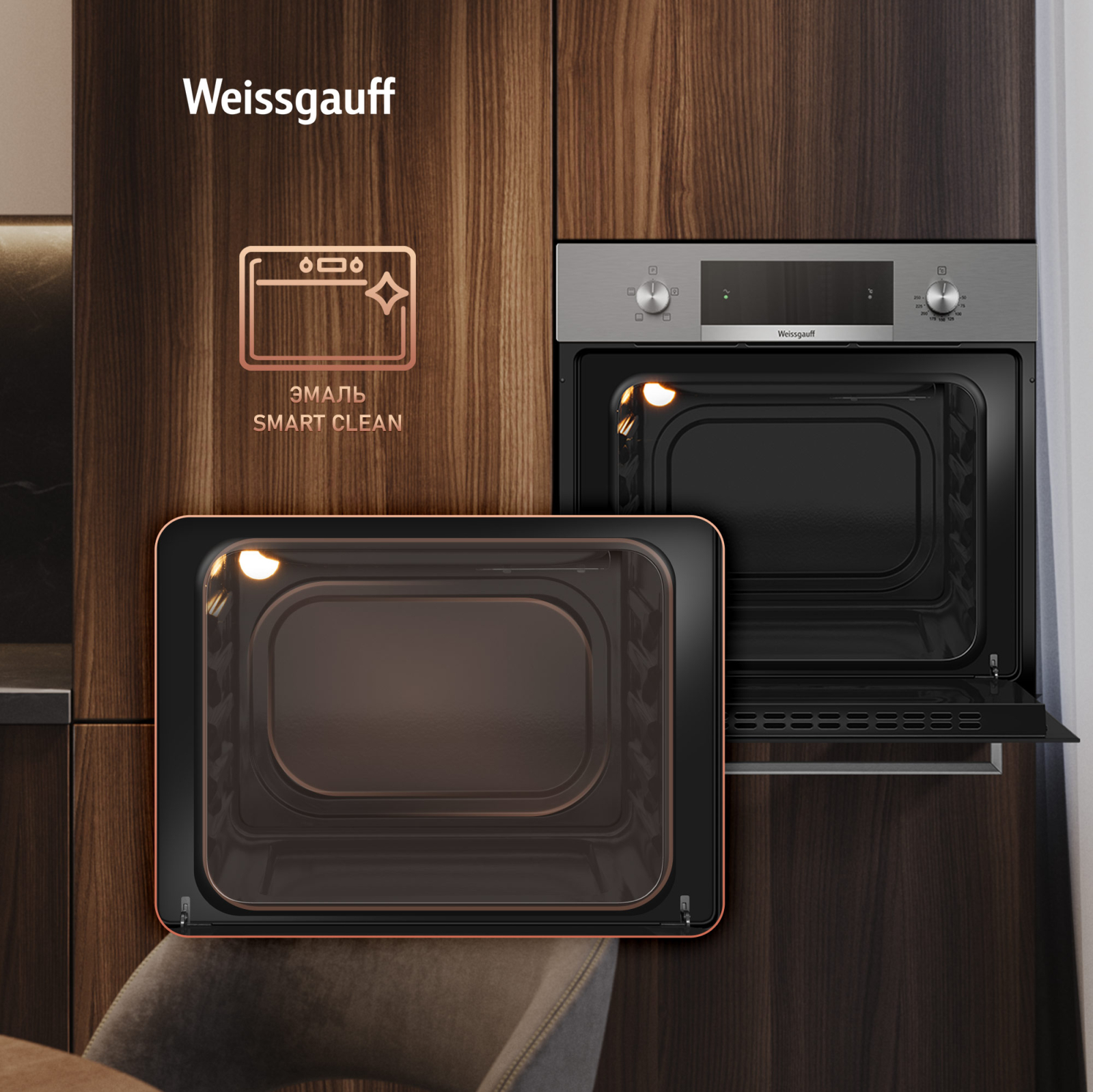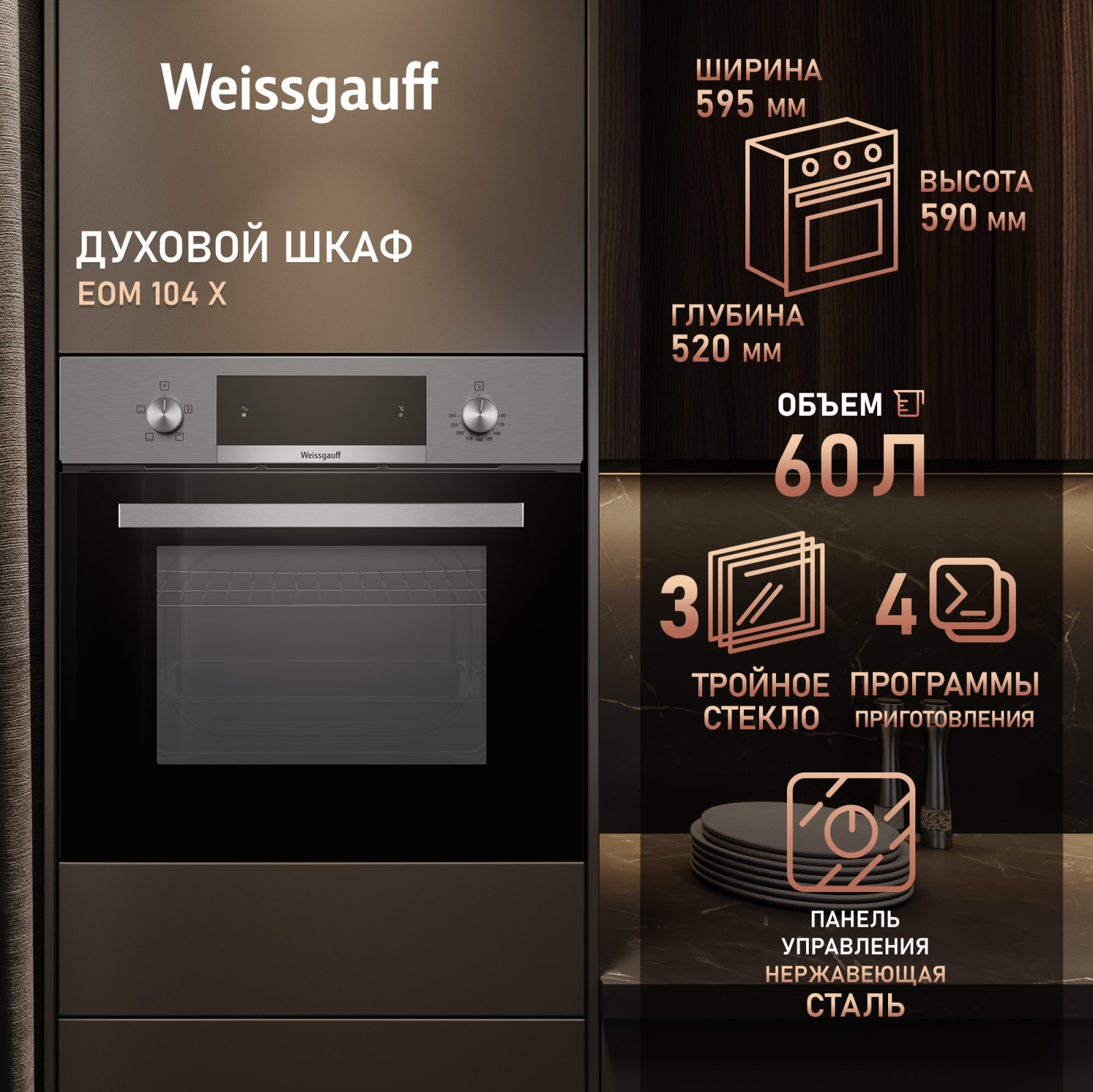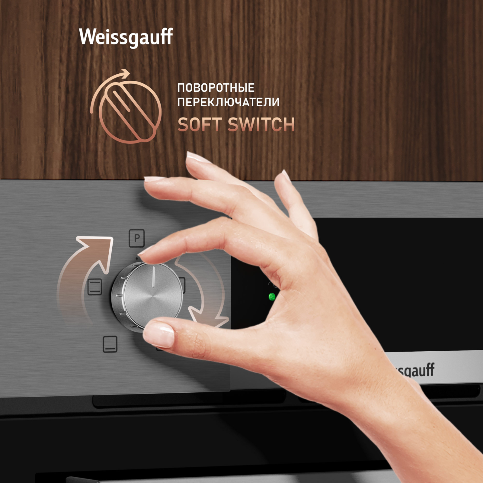 Электрический духовой шкаф от Weissgauff, выполненный в цвете "нержавеющая сталь", оснащённый механическими поворотными рукоятками Soft Switch, тройным остеклением дверцы и 4 режимами, буквально олицетворяет собой уверенность в надёжном и функциональном оснащении вашей кухни!