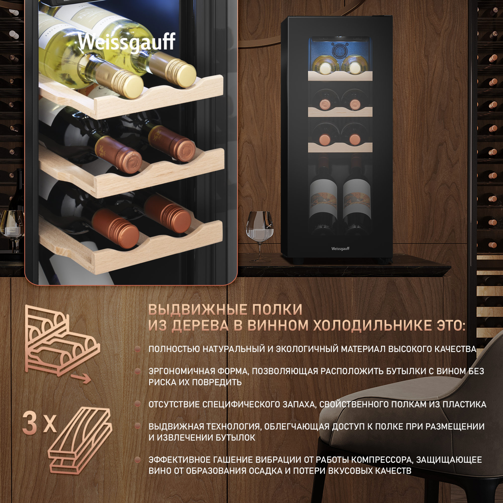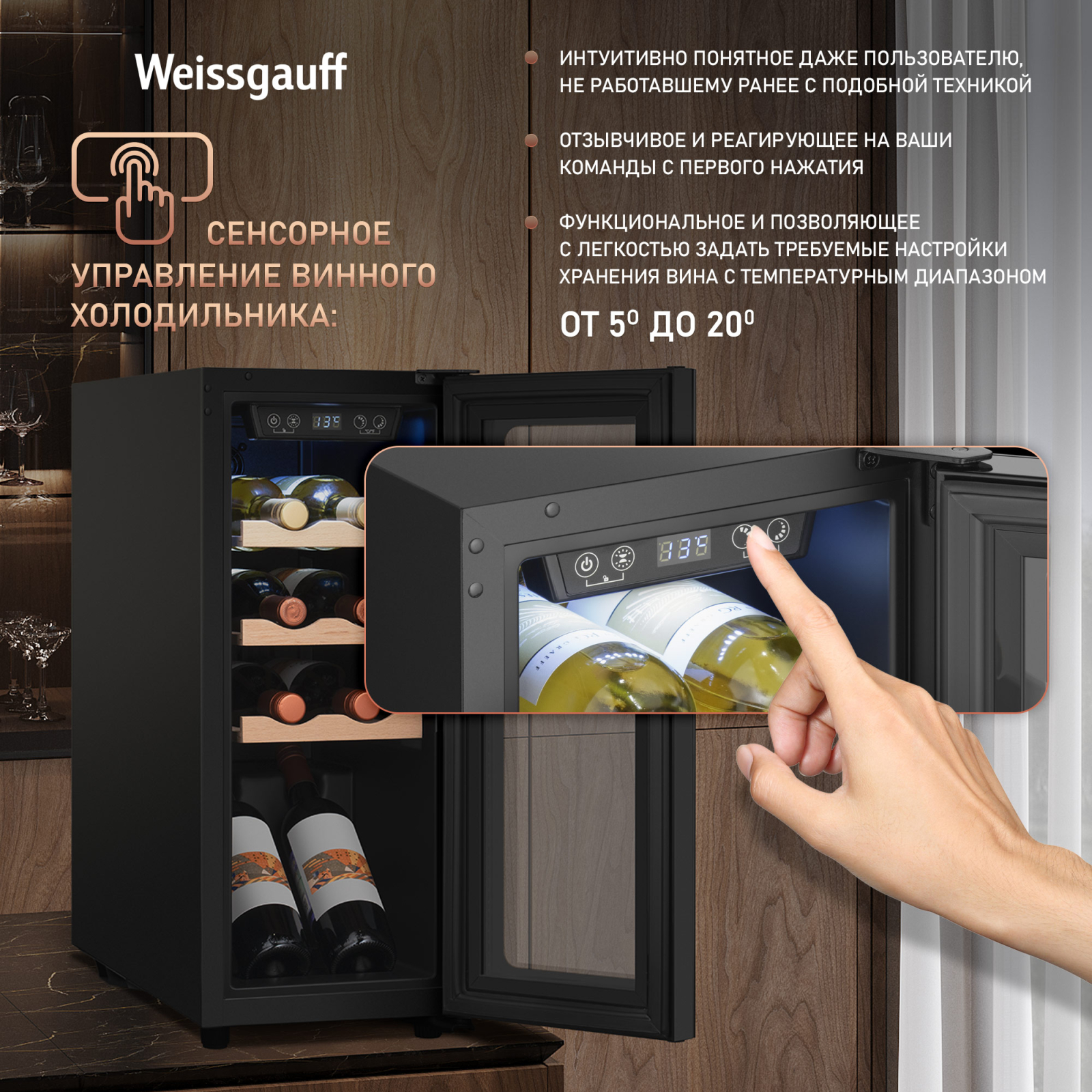 Weissgauff представляет вашему вниманию отдельностоящий винный холодильник с компрессором, обладающий вместительностью на 8 бутылок, с полностью электронным управлением и чувствительной настройкой температурного режима!