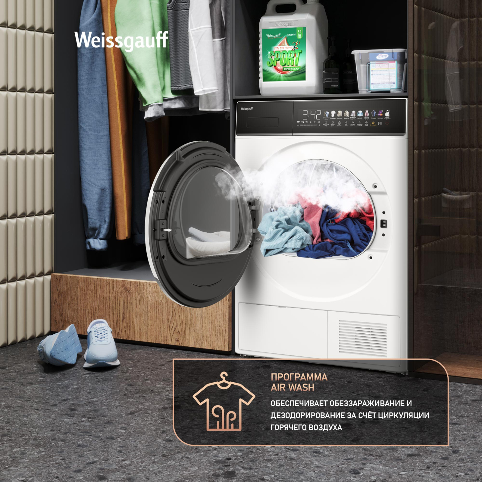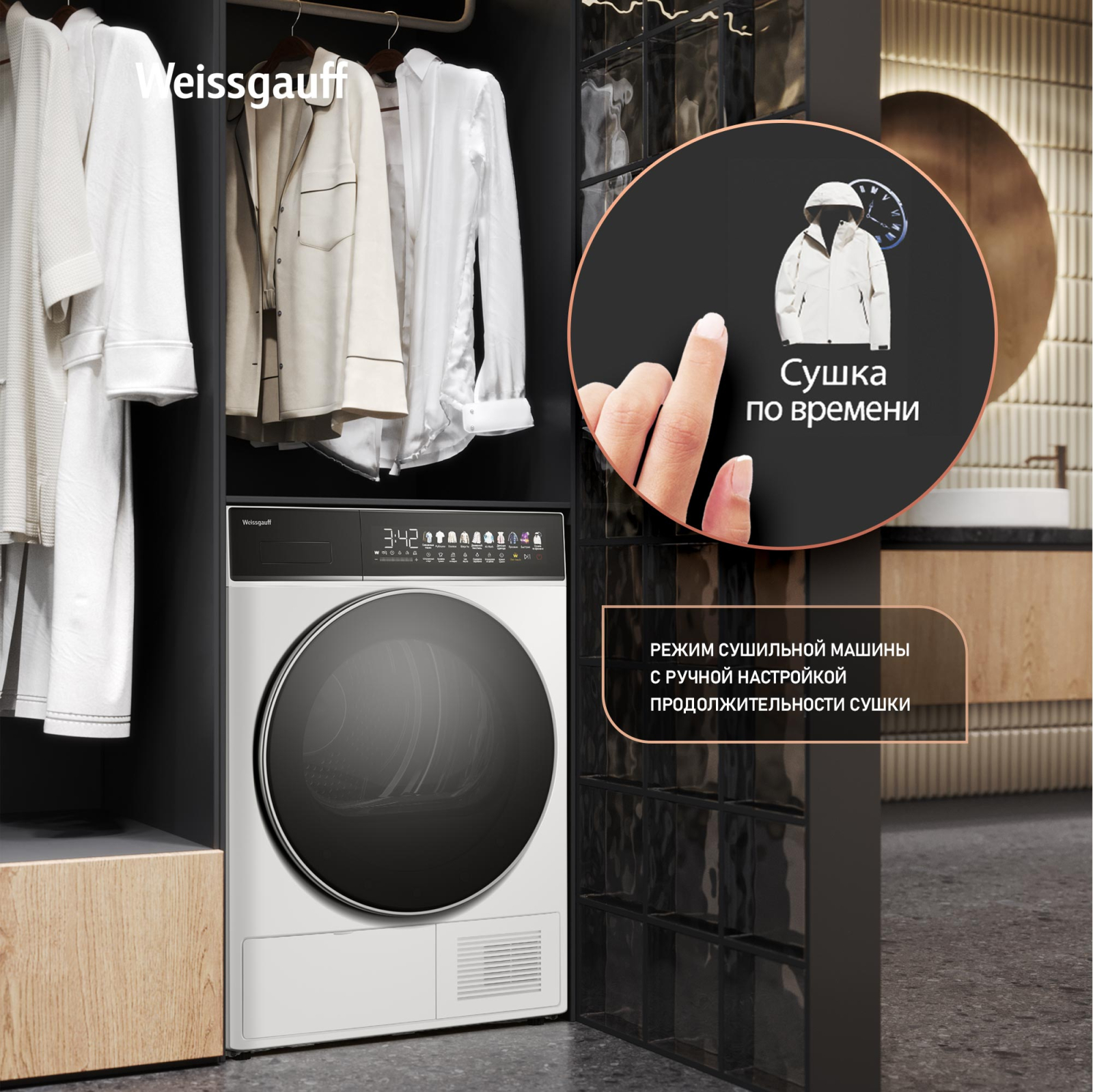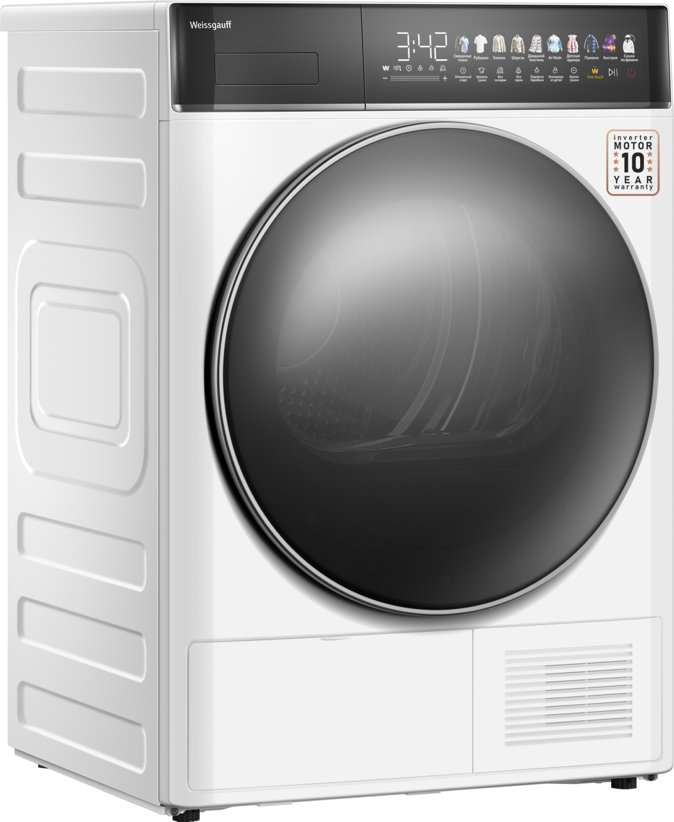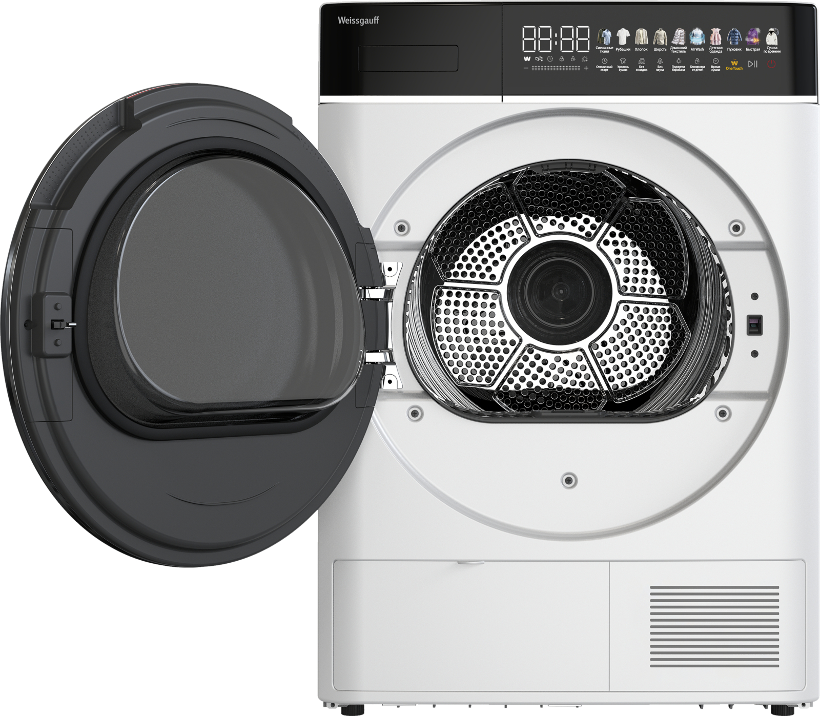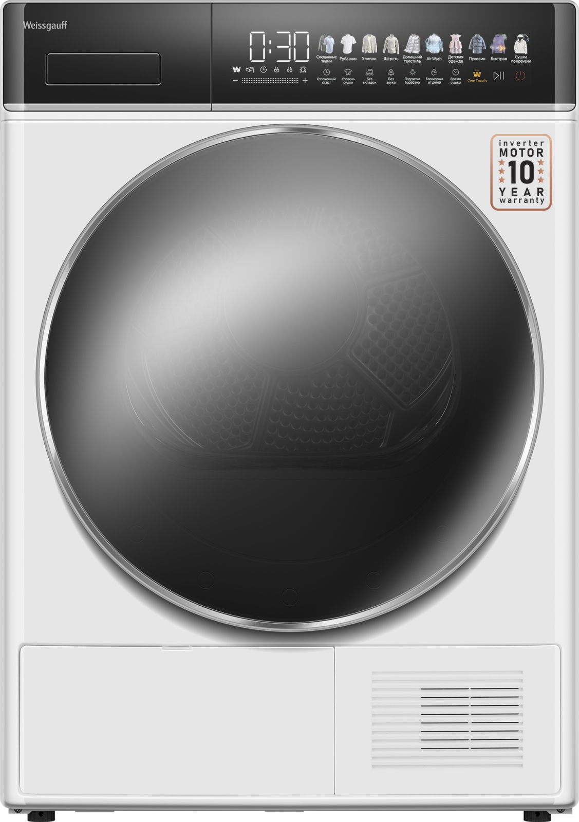 Отдельностоящая сушильная машина Weissgauff, оснащенная тепловой помпой и инверторным двигателем, имеет показатель загрузки до 8 килограммов белья, а также инновационный увеличенный цветной дисплей SMART SCREEN с сенсорным управлением, что делает данную модель не только эффективной, но и по-настоящему удобной в работе!