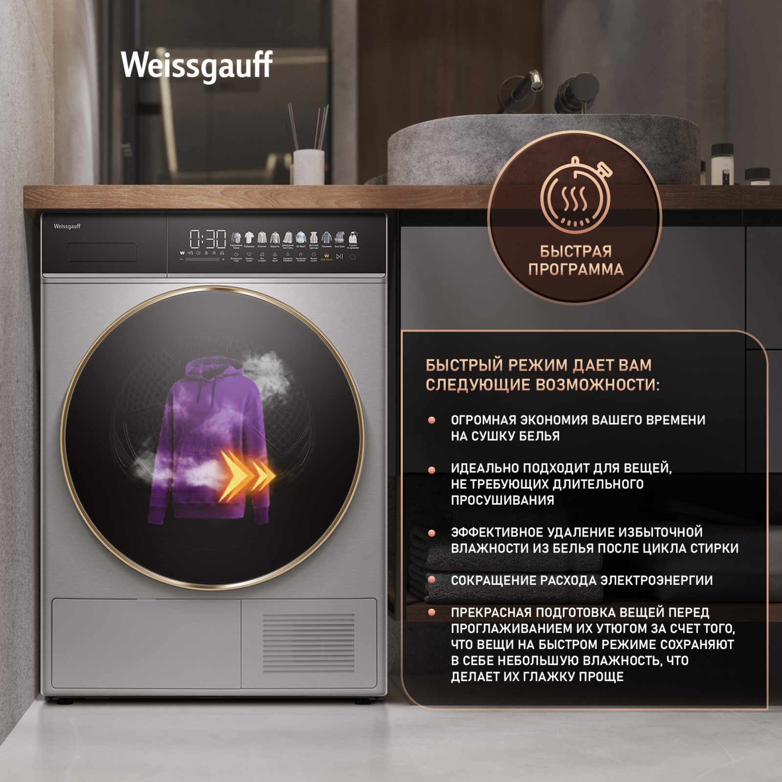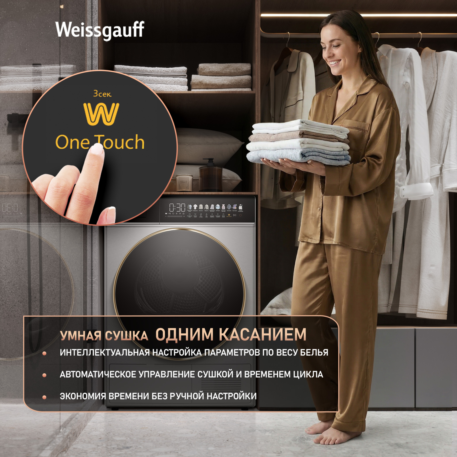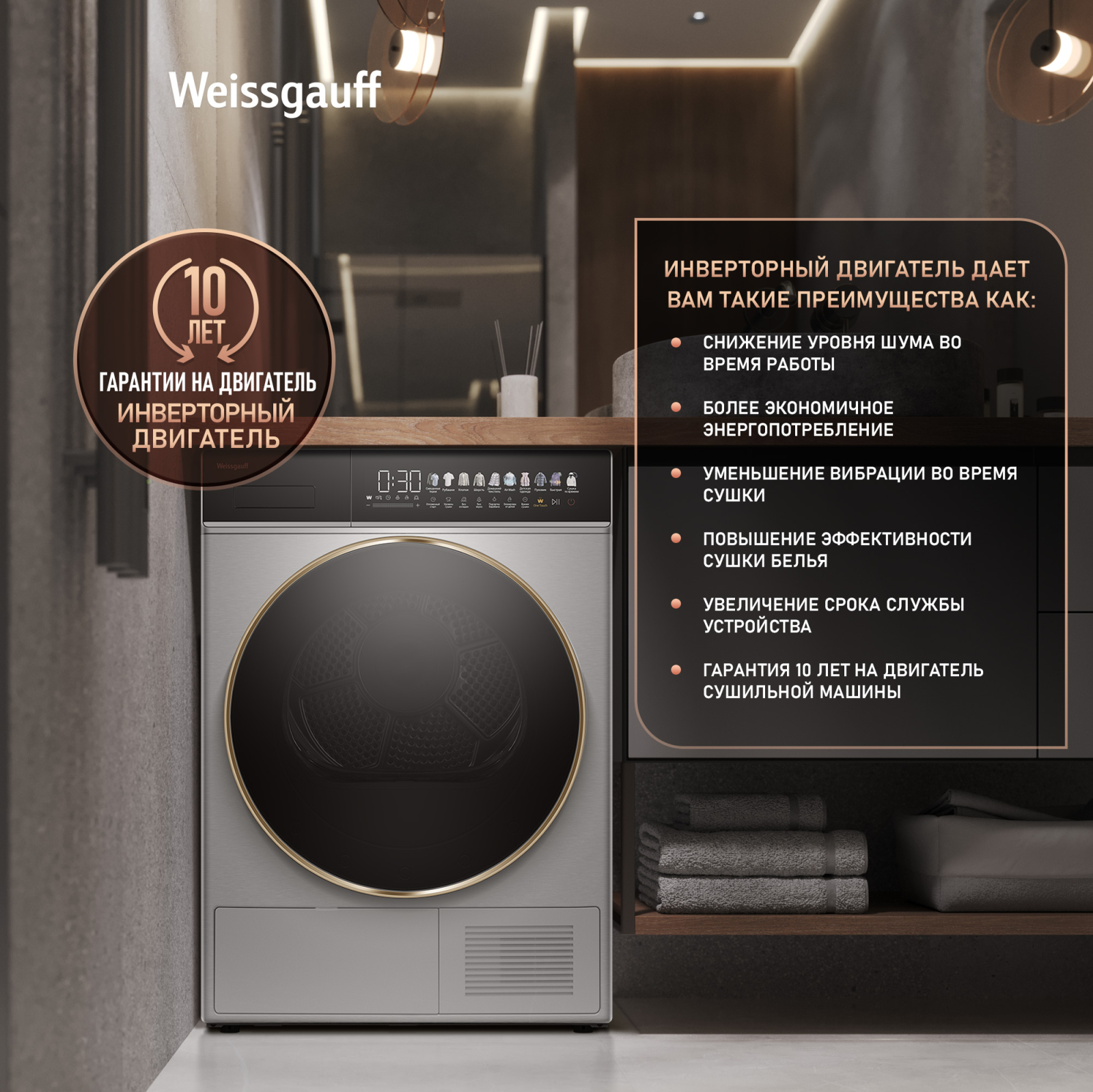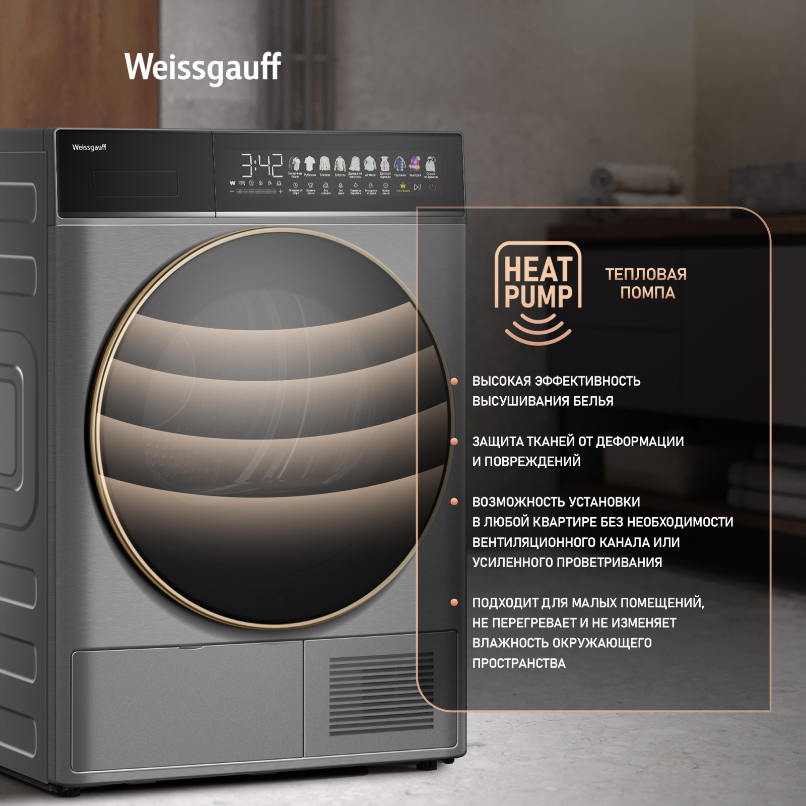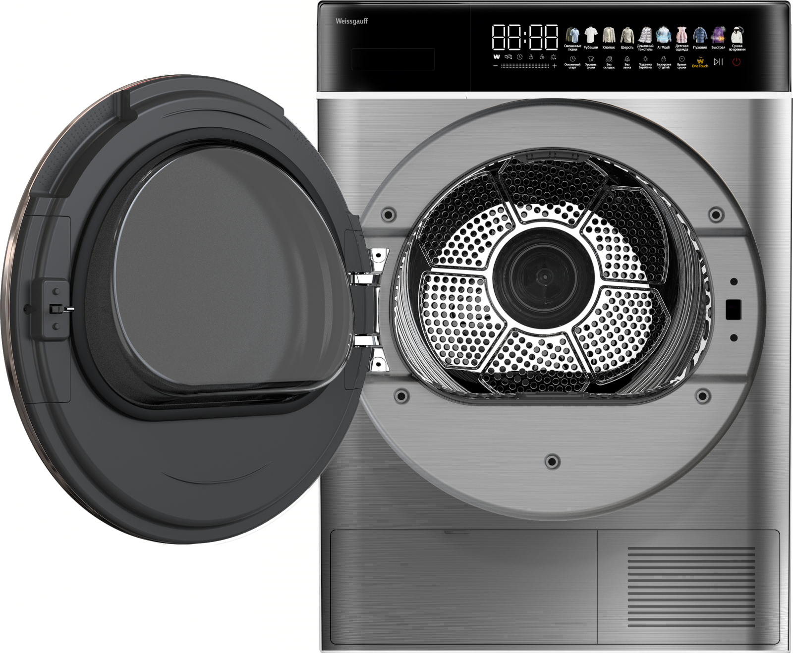 Отдельностоящая сушильная машина Weissgauff, оснащенная тепловой помпой и инверторным двигателем, имеет показатель загрузки до 8 килограммов белья, а также инновационный увеличенный цветной дисплей SMART SCREEN с сенсорным управлением, что делает данную модель не только эффективной, но и по-настоящему удобной в работе!