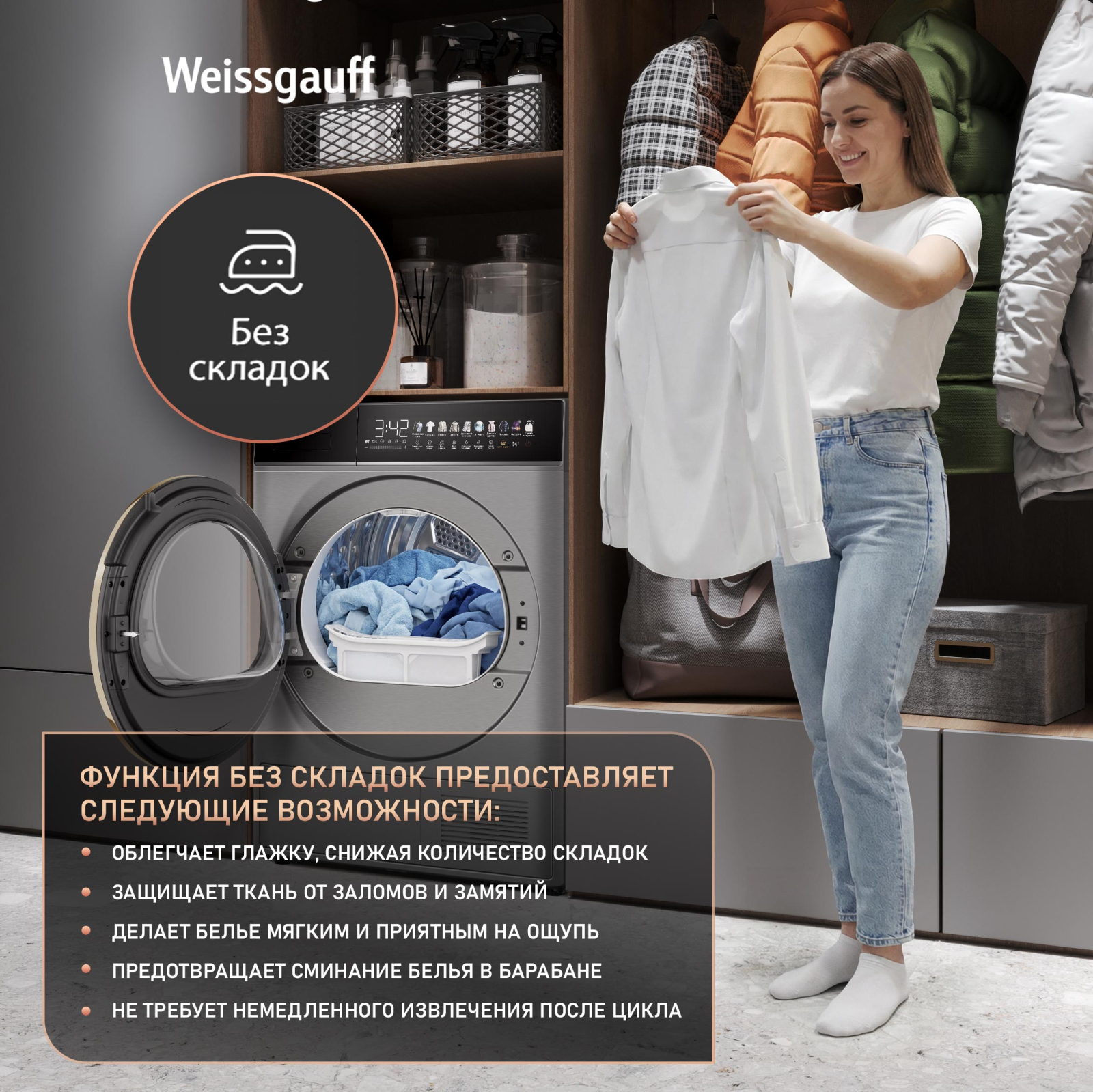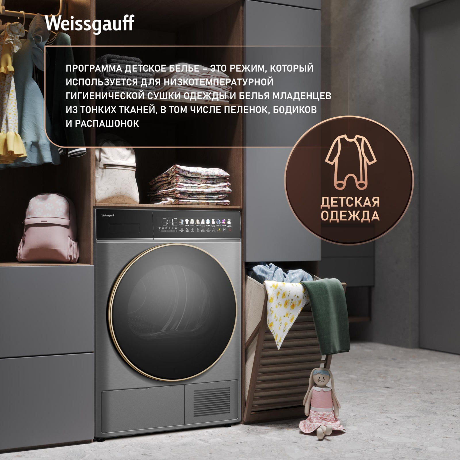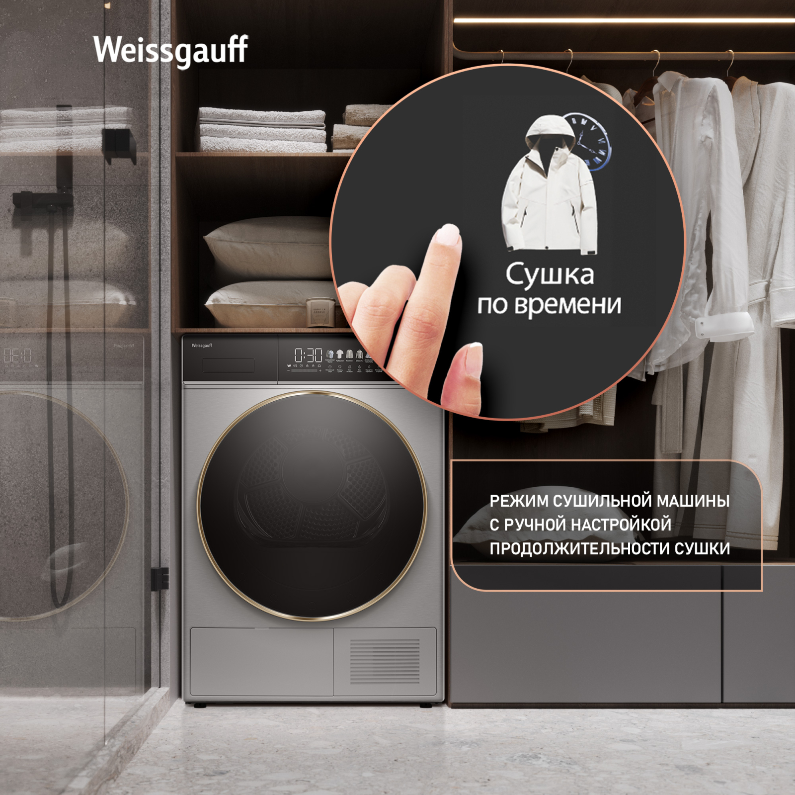 FAMILY- комплект! Данная модель идеальна для установки в колонну со стиральной машиной Weissgauff WM 58411 Direct Drive Inverter Premium Steam Steel, образуя цельный и гармоничный комплект бытовой техники, выполненный в едином дизайне! Обратите внимание, что для установки в колонну потребуется дополнительно приобрести соединительный элемент Weissgauff WSK 50400 Steel