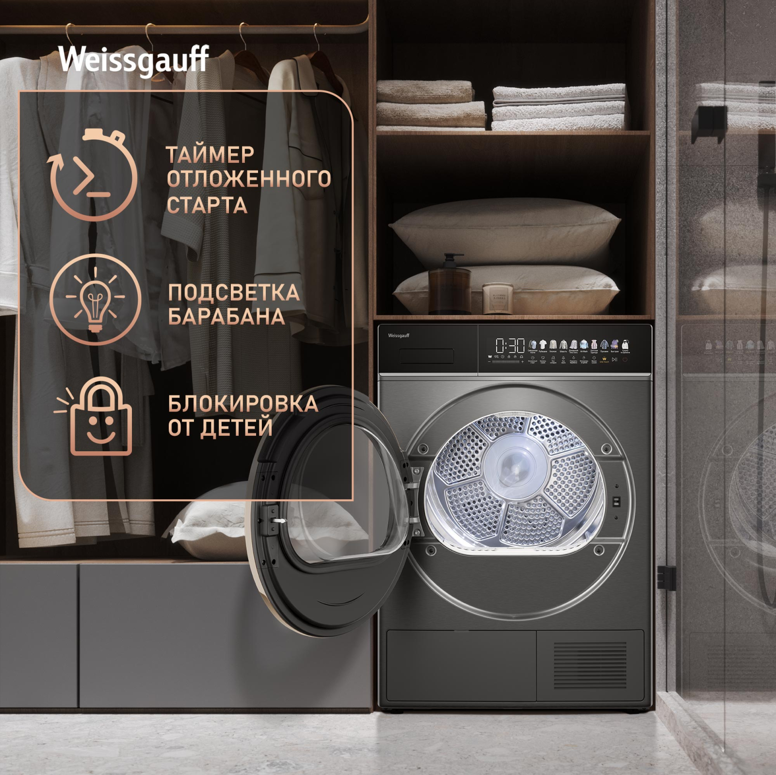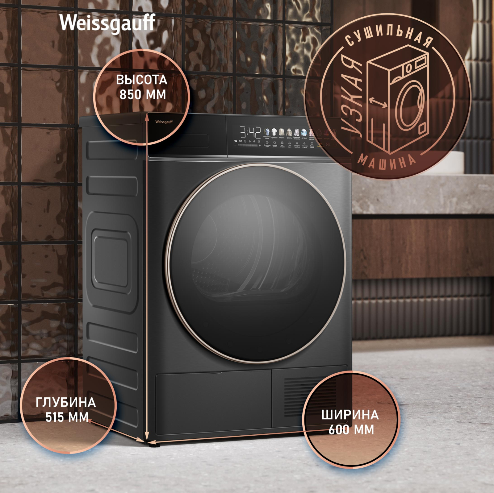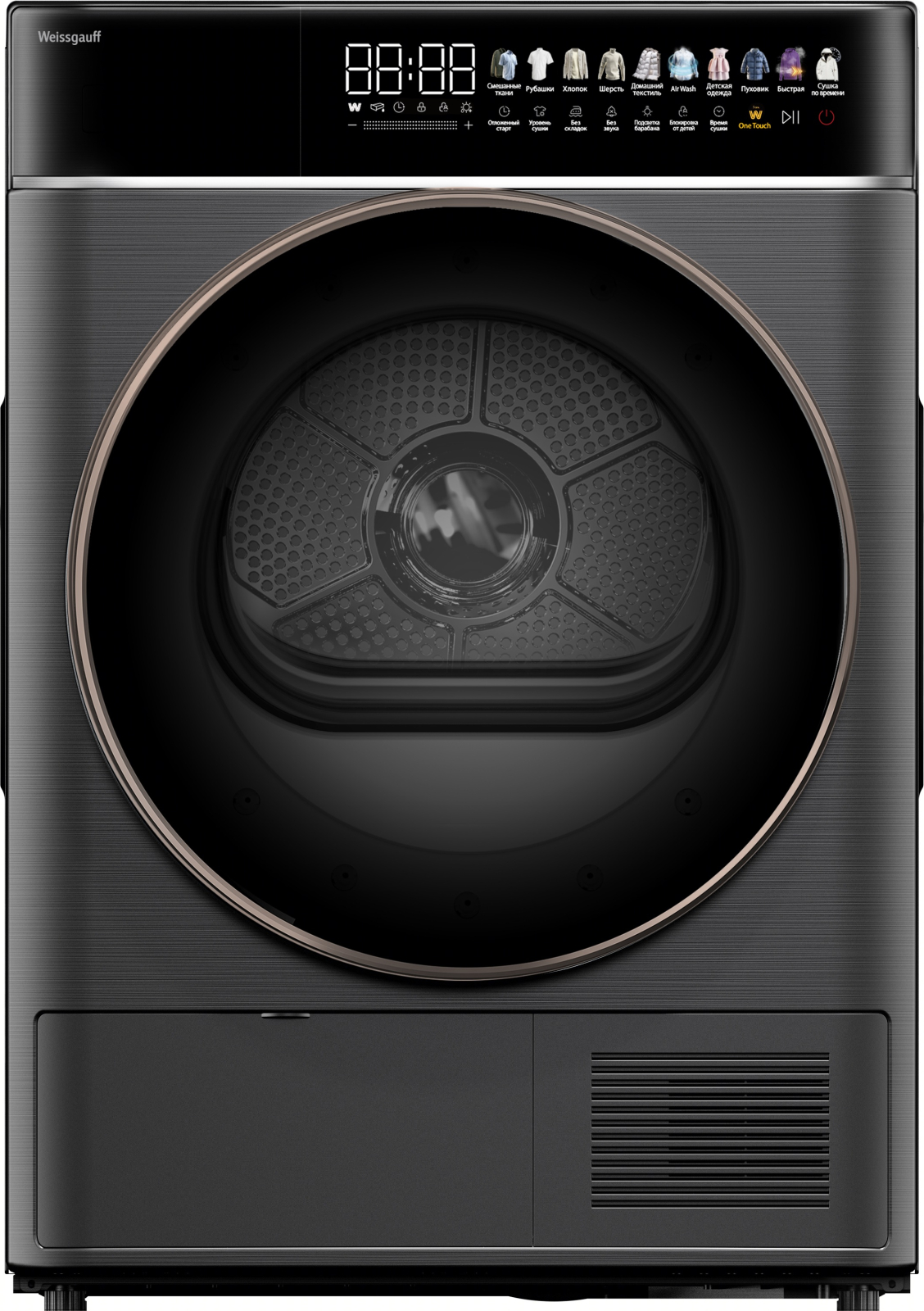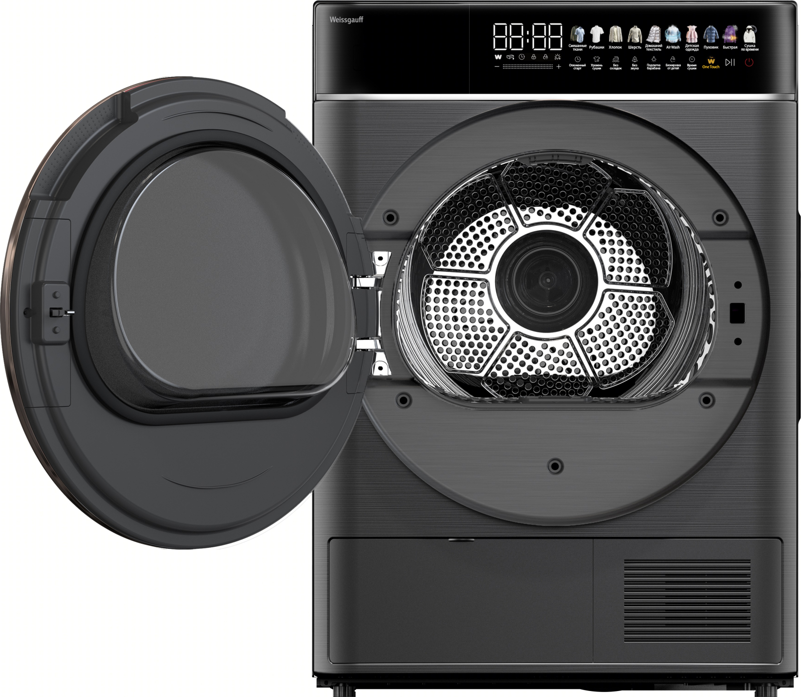 Отдельностоящая сушильная машина Weissgauff, оснащенная тепловой помпой и инверторным двигателем, имеет показатель загрузки до 8 килограммов белья, а также инновационный увеличенный цветной дисплей SMART SCREEN с сенсорным управлением, что делает данную модель не только эффективной, но и по-настоящему удобной в работе!