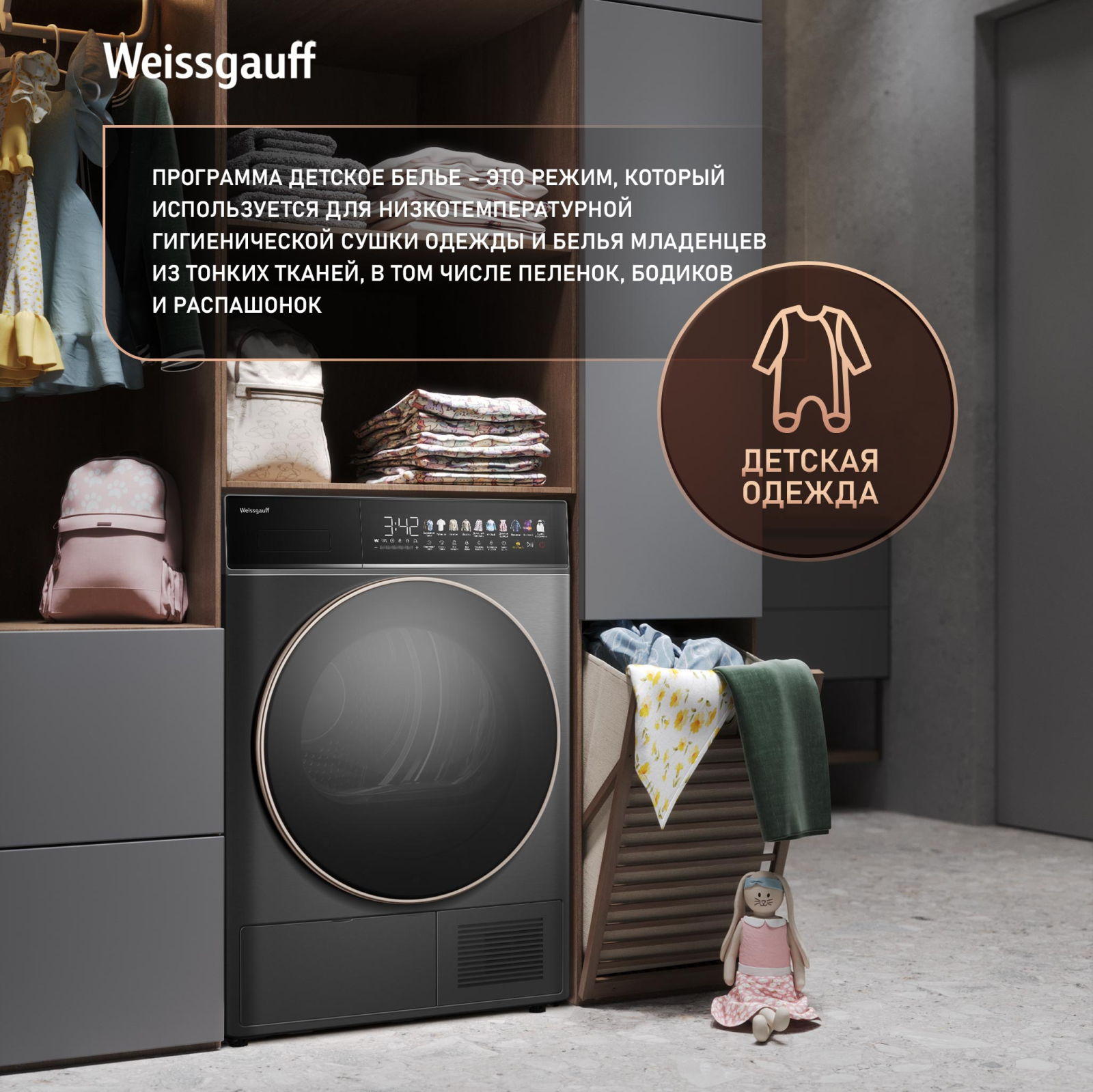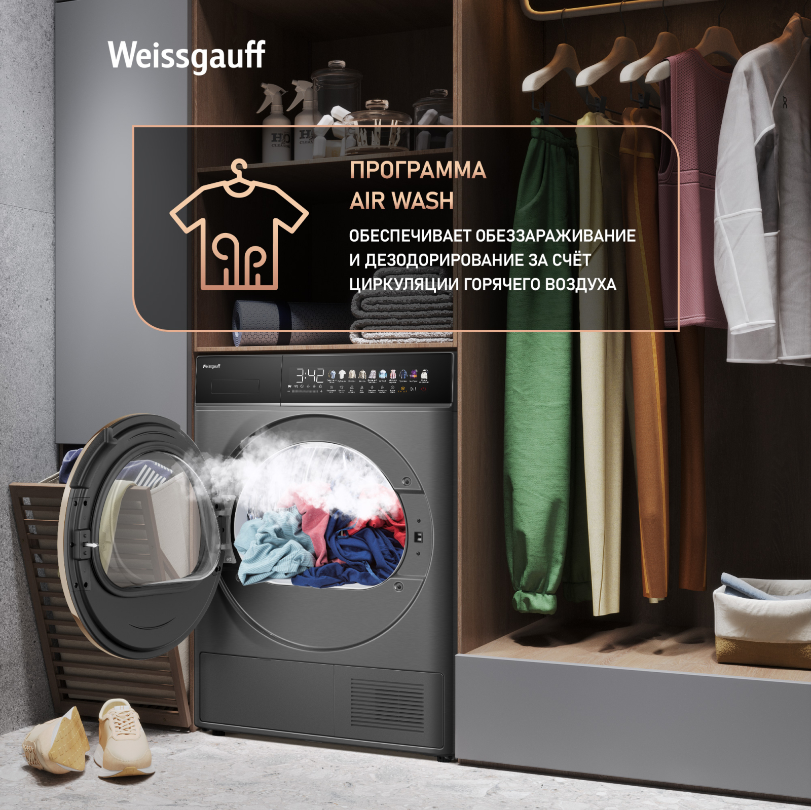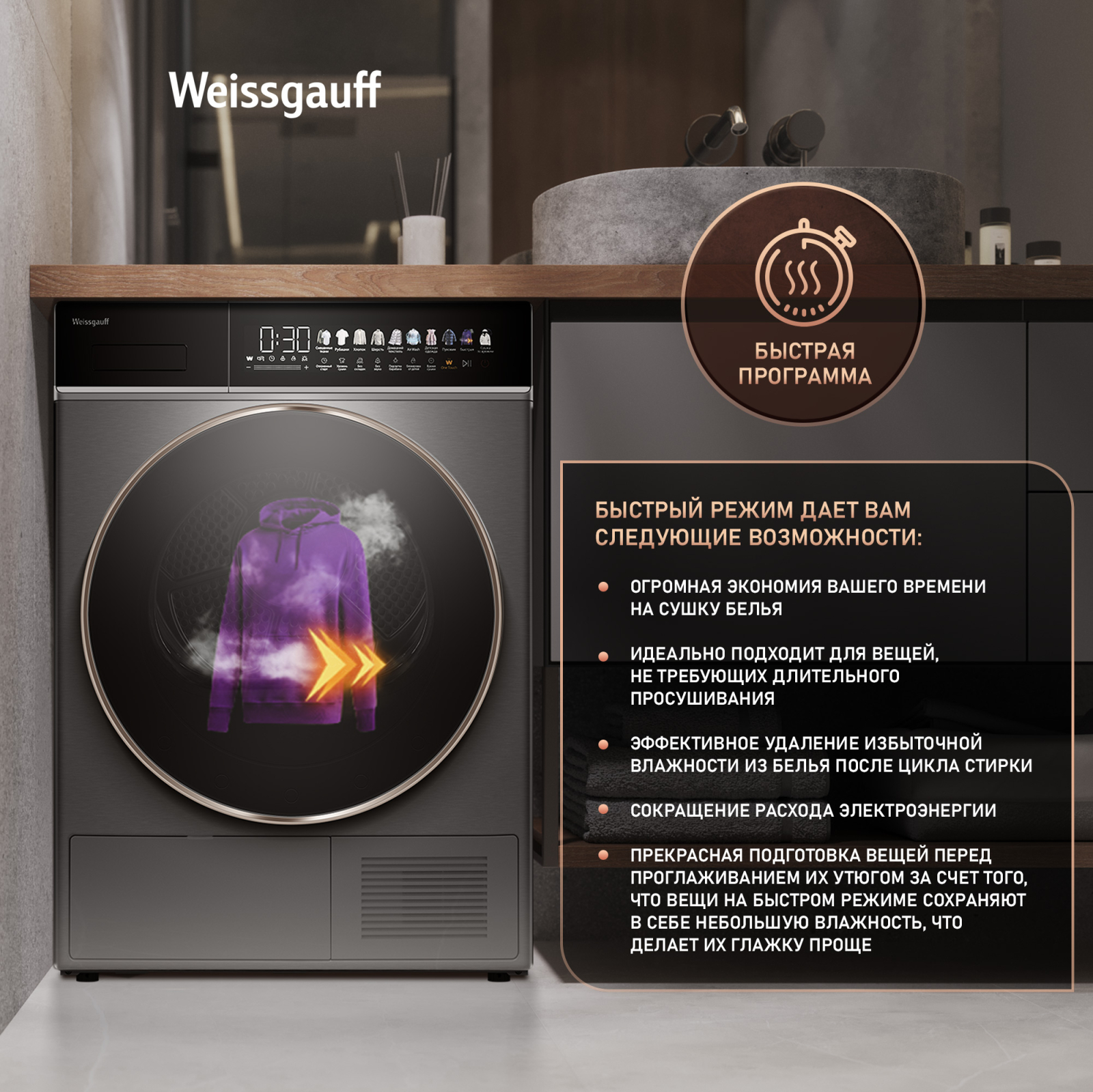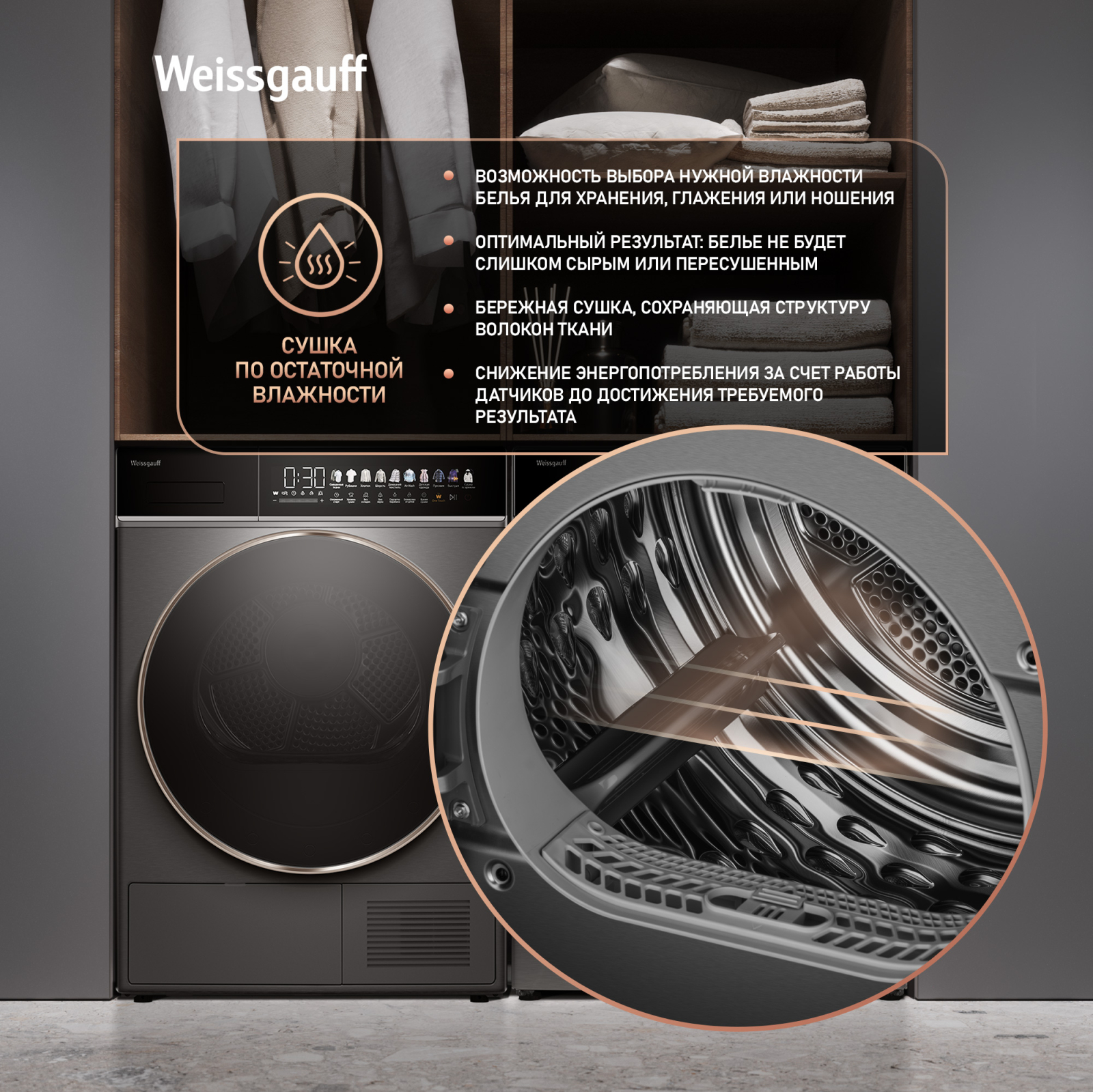 Отдельностоящая сушильная машина Weissgauff, оснащенная тепловой помпой и инверторным двигателем, имеет показатель загрузки до 8 килограммов белья, а также инновационный увеличенный цветной дисплей SMART SCREEN с сенсорным управлением, что делает данную модель не только эффективной, но и по-настоящему удобной в работе!