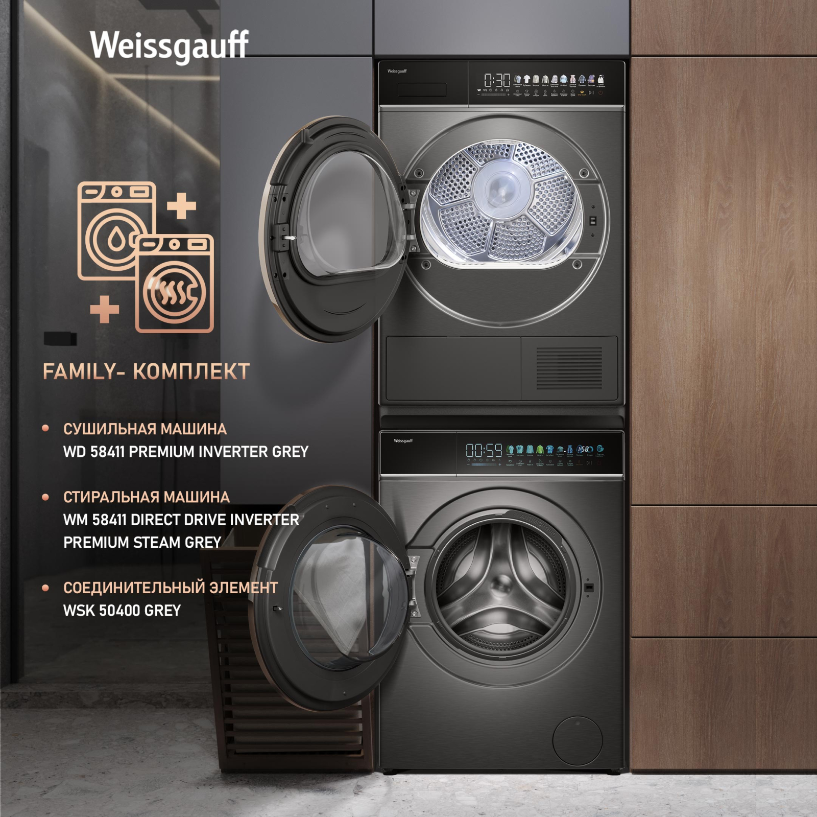FAMILY- комплект! Данная модель идеальна для установки в колонну со стиральной машиной Weissgauff WM 58411 Direct Drive Inverter Premium Steam Grey, образуя цельный и гармоничный комплект бытовой техники, выполненный в едином дизайне! Обратите внимание, что для установки в колонну потребуется дополнительно приобрести соединительный элемент Weissgauff WSK 50400 Grey