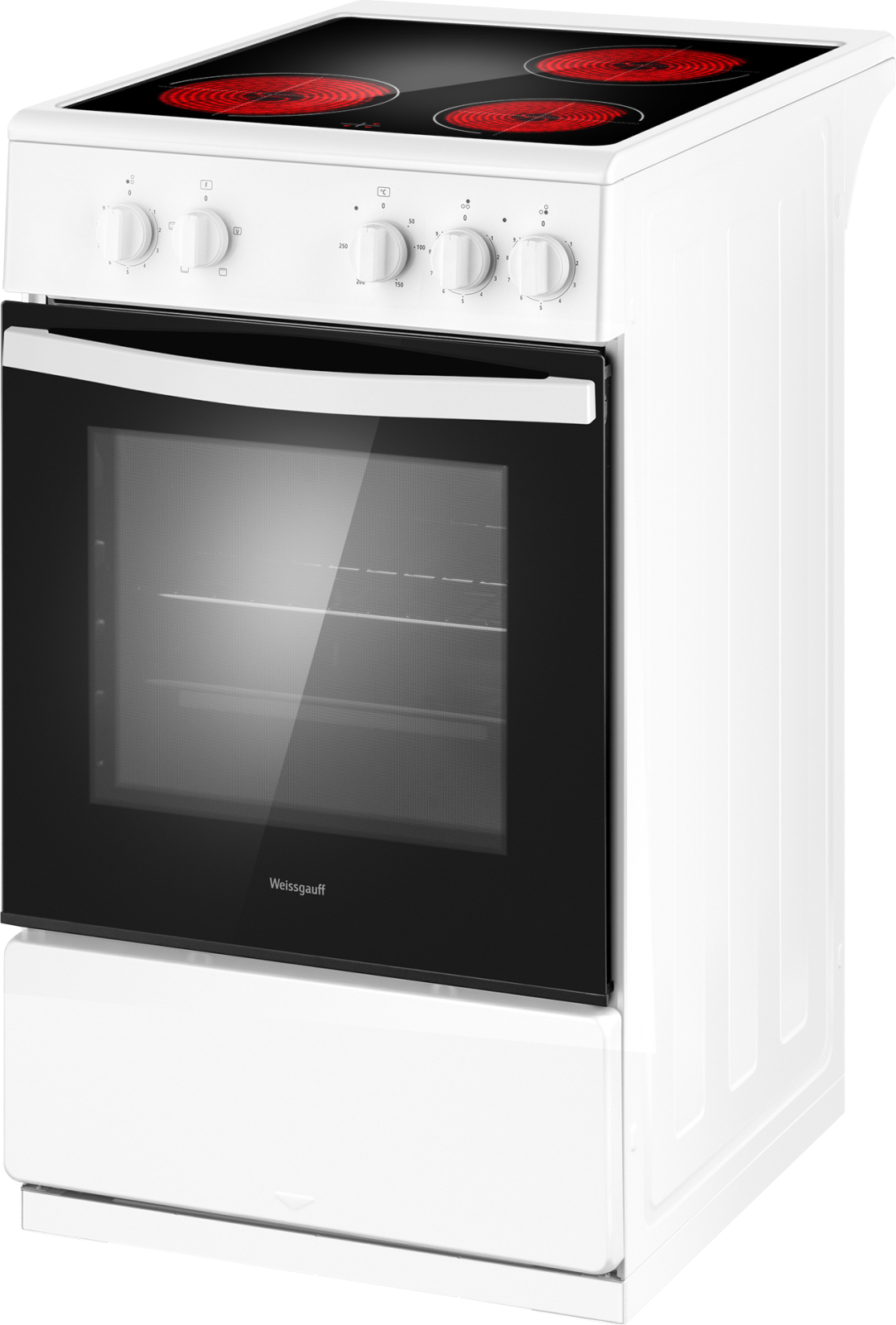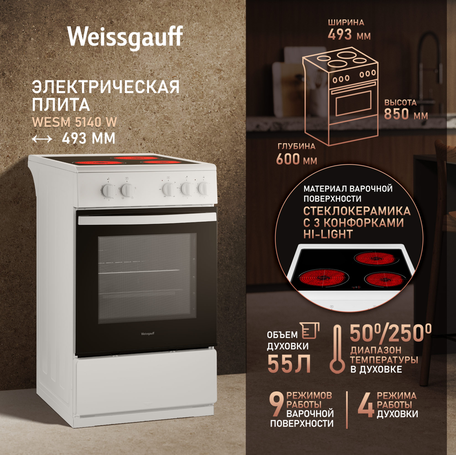 Электрическая отдельностоящая плита Weissgauff шириной всего 50 см, оснащенная духовкой с впечатляющим объемом 55 литров, а также стеклокерамической панелью с 3 Hi-Light конфорками и 1 зоной для размещения посуды без нагрева - это сочетание великолепной функциональности и практичности, воплощенное в бытовой технике, которая станет сердцем вашей кухни на долгие годы!