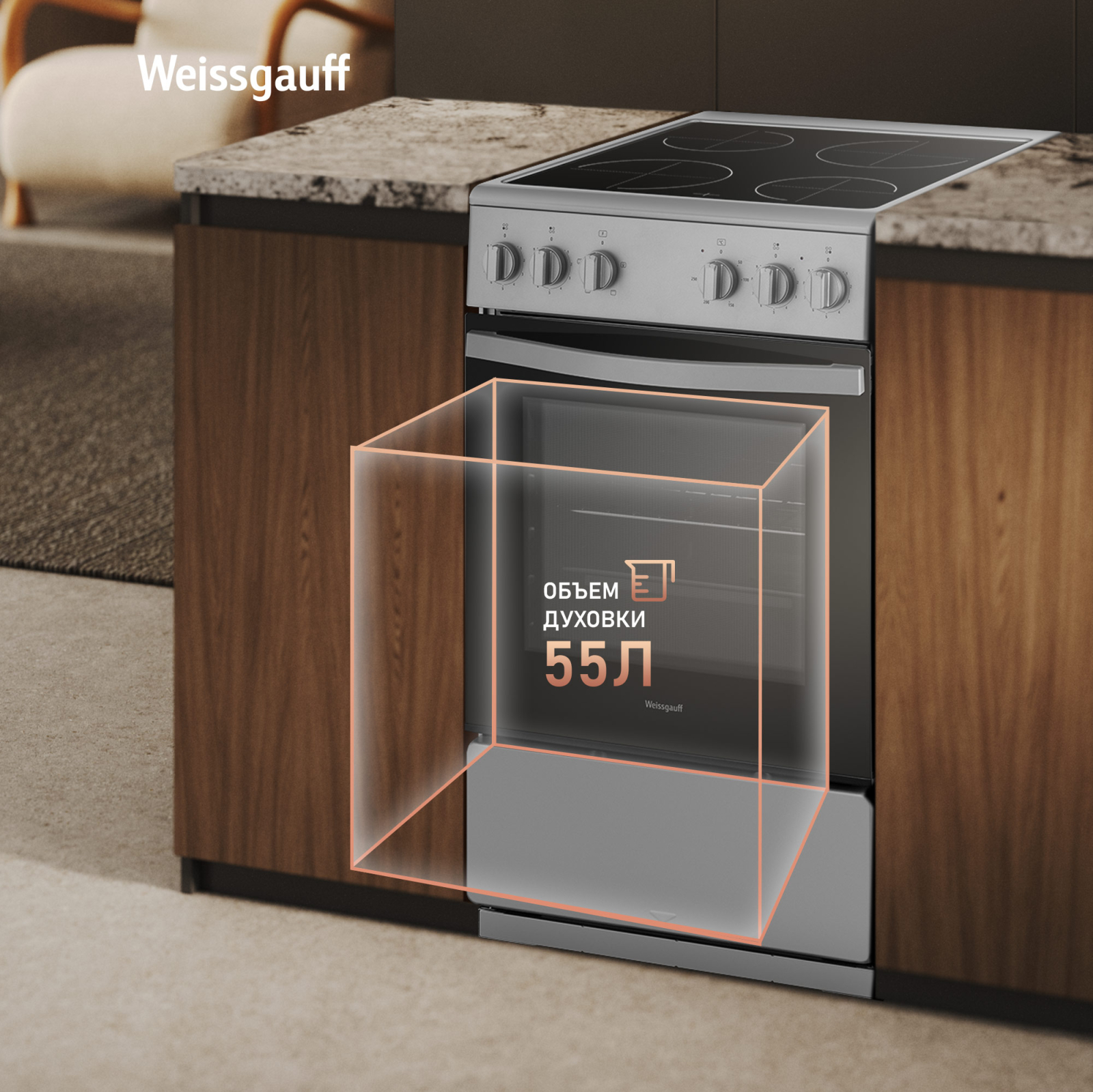 Электрическая отдельностоящая плита Weissgauff шириной всего 50 см, оснащенная духовкой с впечатляющим объемом 55 литров, а также стеклокерамической панелью с 4 Hi-Light конфорками - это сочетание великолепной функциональности и практичности, воплощенное в бытовой технике, которая станет сердцем вашей кухни на долгие годы!