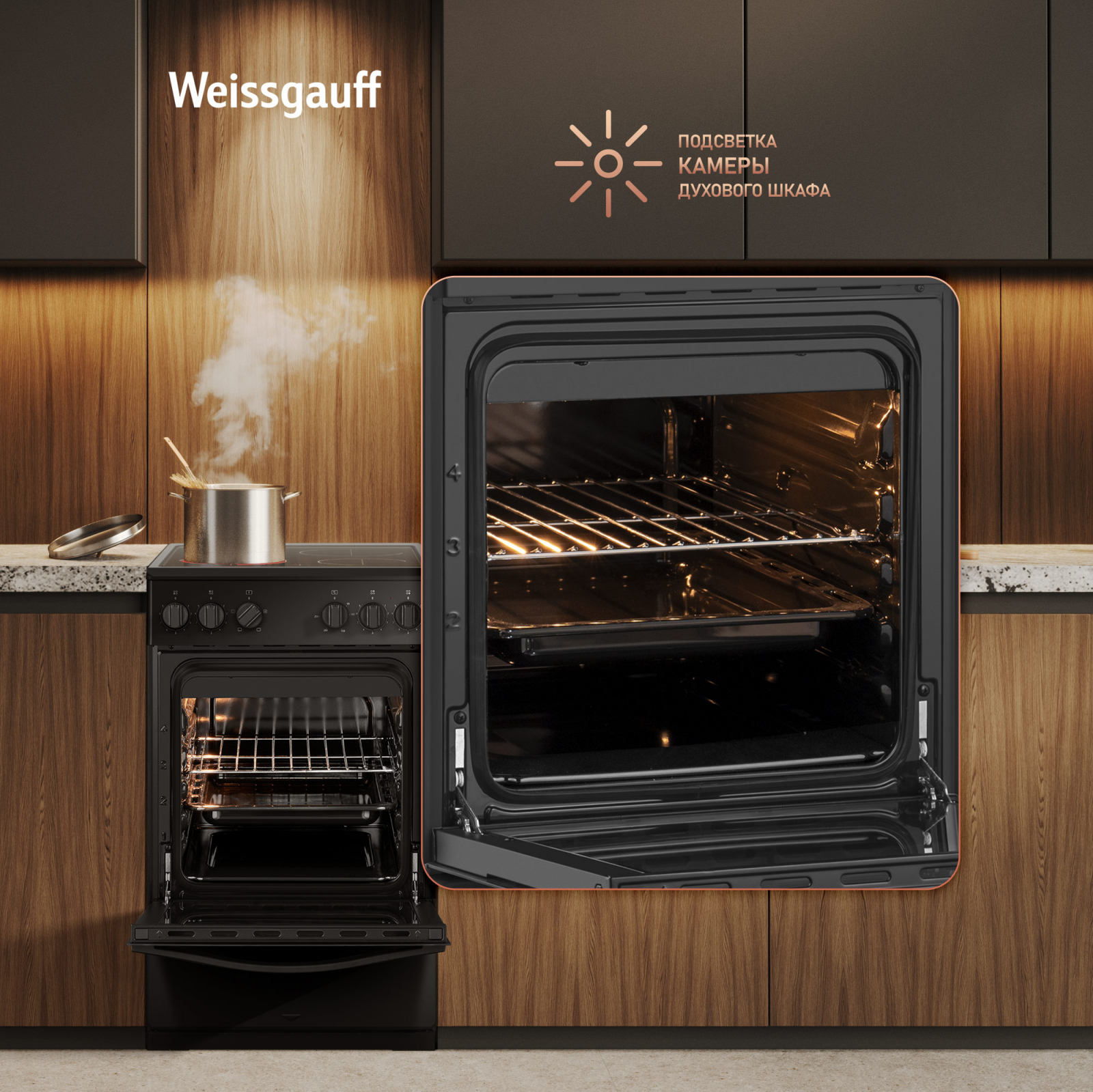 Электрическая отдельностоящая плита Weissgauff шириной всего 50 см, оснащенная духовкой с впечатляющим объемом 55 литров, а также стеклокерамической панелью с 4 Hi-Light конфорками - это сочетание великолепной функциональности и практичности, воплощенное в бытовой технике, которая станет сердцем вашей кухни на долгие годы!