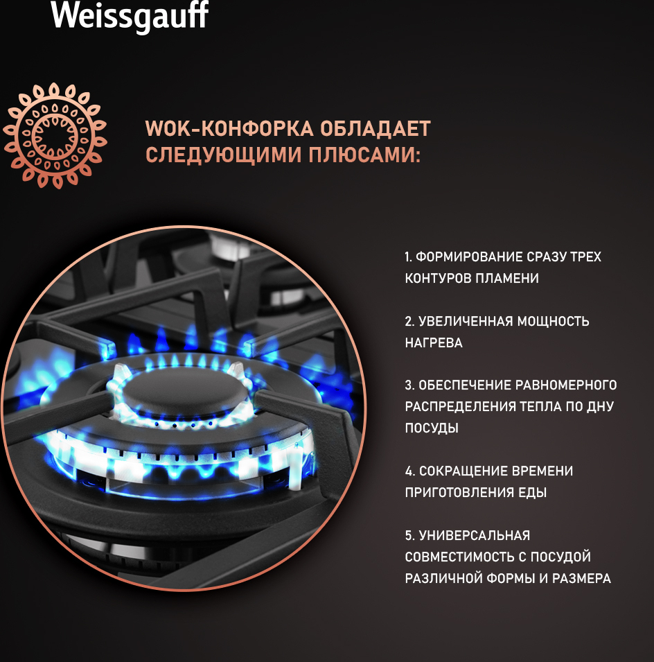Варочная панель Weissgauff, оснащённая системой "Газ-контроль" и мощной WOK-конфоркой, создающей сразу 3 независимых контура пламени - это наиболее современная и функциональная модель Weissgauff, исполненная в чёрном закалённом стекле
