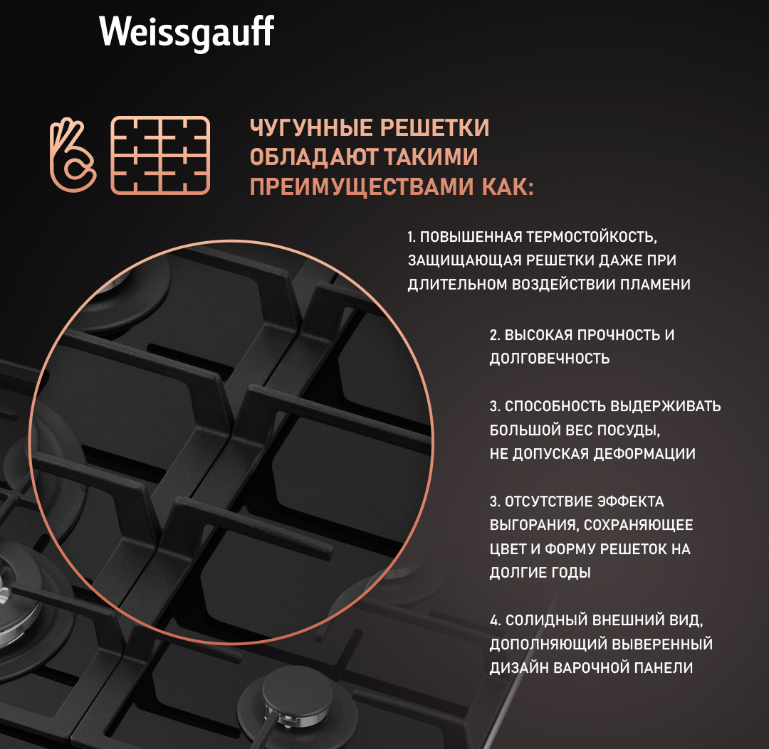 Решетки из высококачественного чугуна это неизменное качество, надежность и долговечность, воплощенные в каждой детали! Благодаря особому строению цельных решеток Weissgauff, размещение посуды на них становится ещё более удобным и устойчивым!