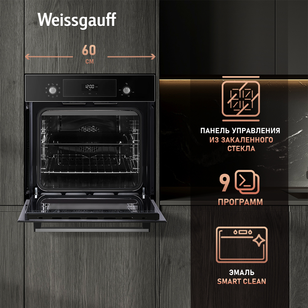 Электрический духовой шкаф от Weissgauff, выполненный в чёрном цвете, оснащённый плавными доводчиками дверцы SOFT CLOSE, утапливаемыми рукоятками PIPO, дисплеем с сенсорным управлением и 9 режимами работы - это сочетание великолепной функциональности и непревзойденной практичности!