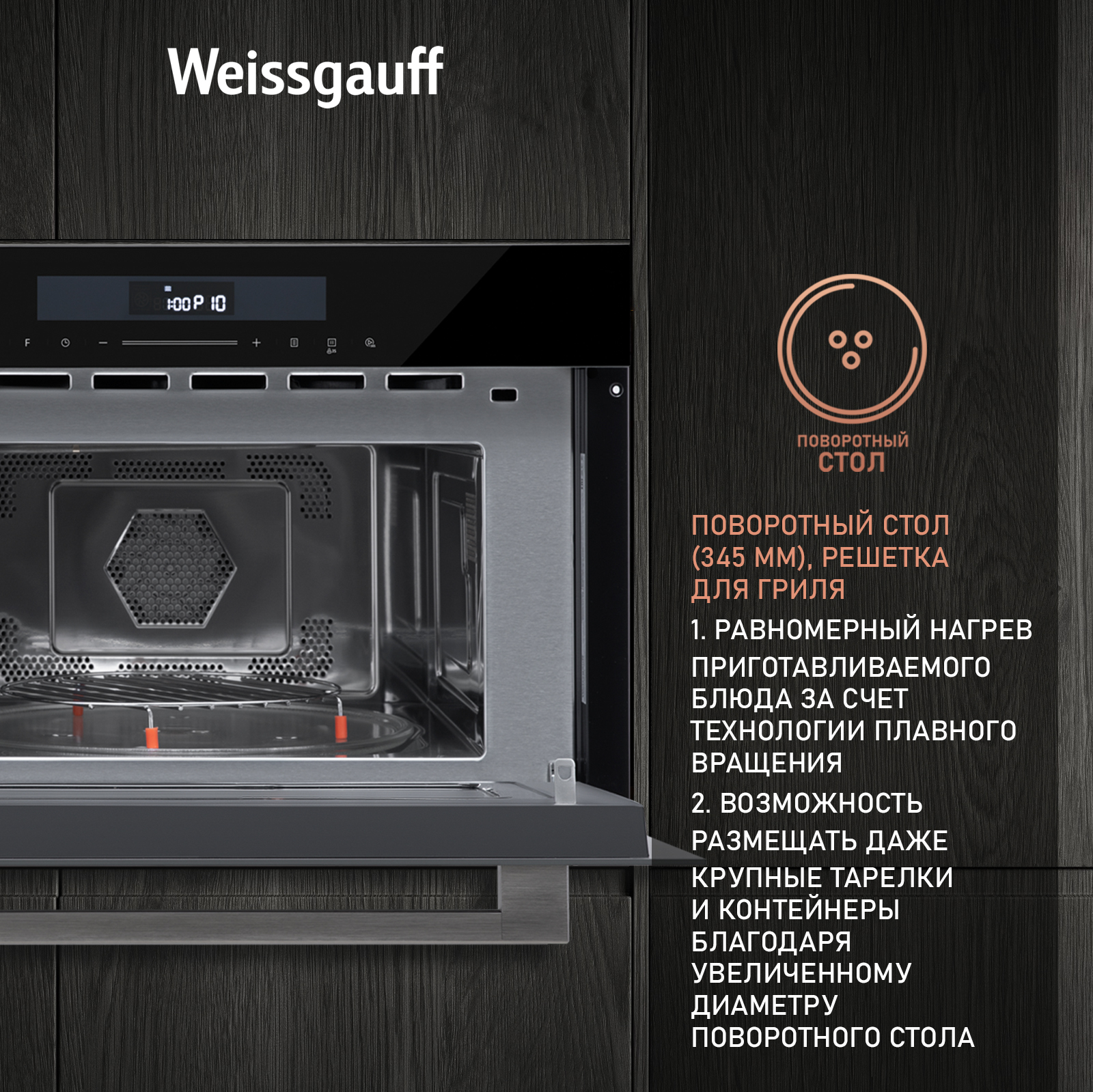 Поворотный стол диаметром 345 мм не только обеспечивает равномерный прогрев блюда со всех сторон, но и удобно извлекается из камеры, делая легкими его очистку и уход