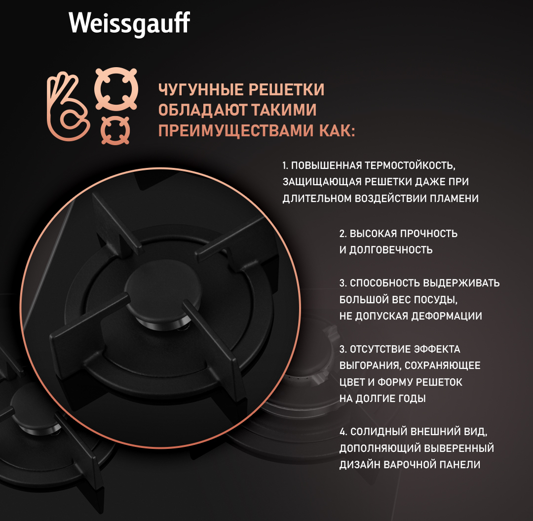 Решетки из высококачественного чугуна это неизменное качество, надежность и долговечность, воплощенные в каждой детали! А особая элегантность их дизайна не только послужит отличным дополнением к общему стилю варочной панели, но и существенно облегчит очистку и уход за ней. А благодаря особому вниманию Weissgauff к каждой детали, вы еще не раз оцените устойчивость и эргономичность этих решеток!