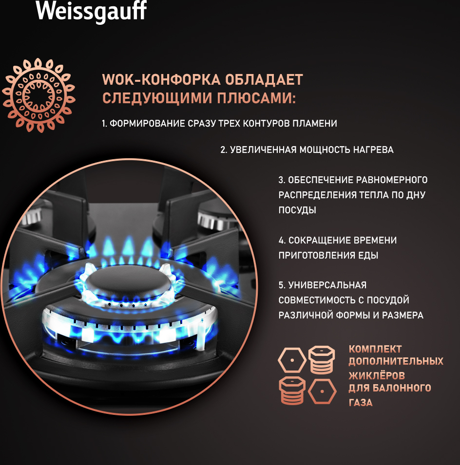 WOK-конфорка мощностью 3,4 кВт, которая создаёт сразу три кольца пламени и позволяет осуществить нагрев даже самой крупногабаритной посуды в кратчайший срок!