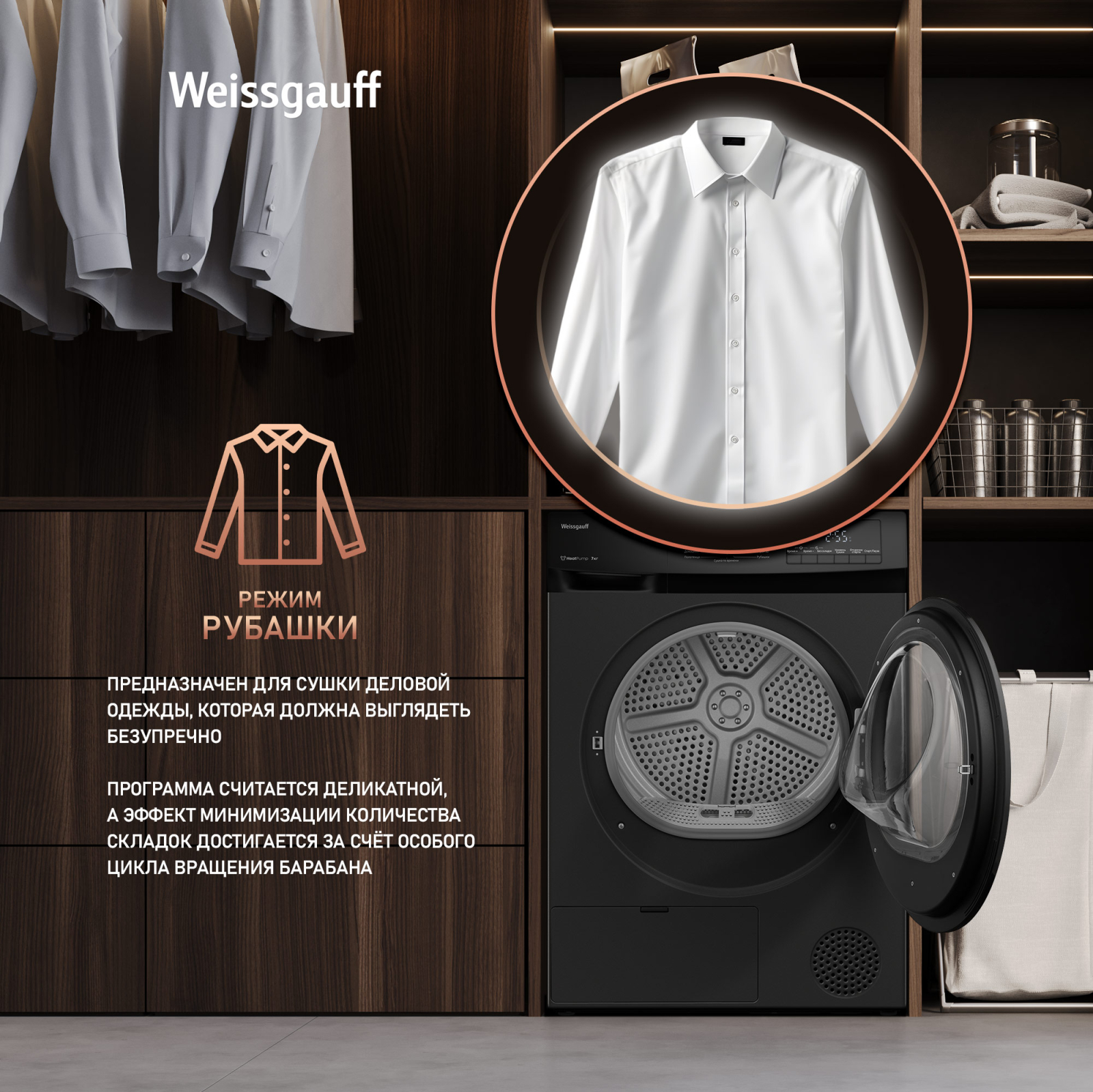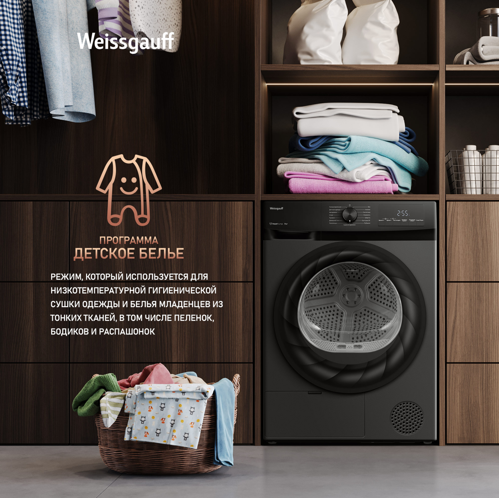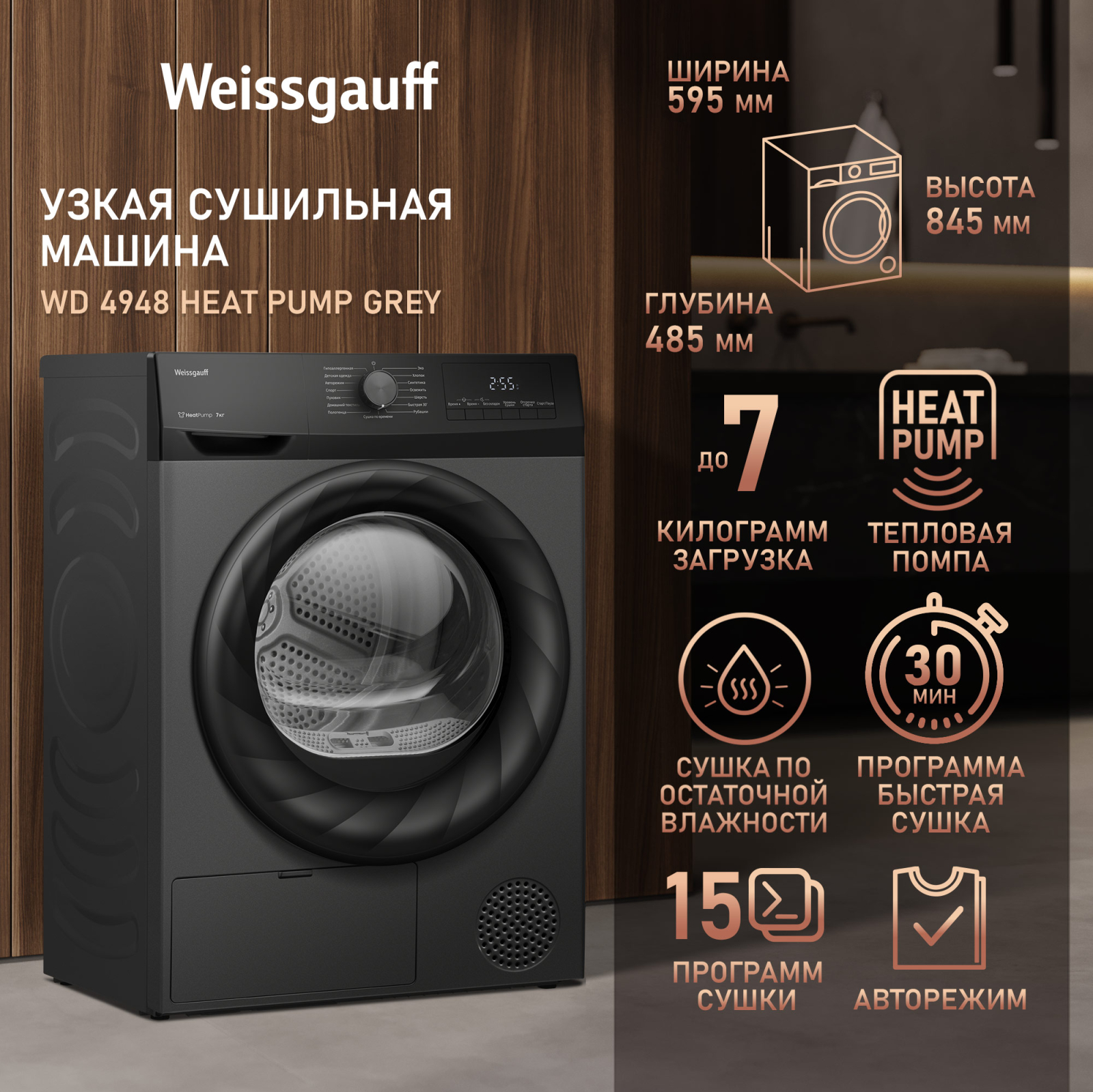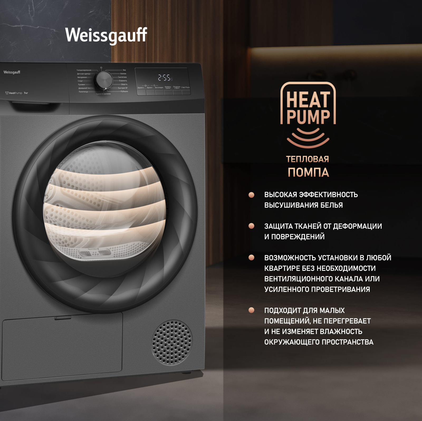 Отдельностоящая сушильная машина Weissgauff, оснащенная тепловой помпой, имеющая впечатляющий показатель загрузки до 7 килограммов белья, и полностью электронное управление, станет для вас гарантией непревзойденной эффективности и высокого результата при каждом запуске этой великолепной модели!