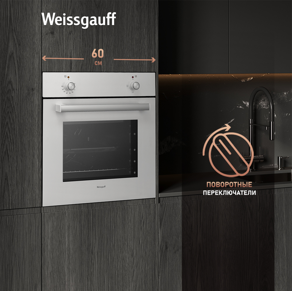 Электрический духовой шкаф от Weissgauff, выполненный в белом цвете, оснащённый механическими поворотными рукоятками Soft Switch и двойным остеклением дверцы воплощает в себе принцип разумной достаточности, предлагаю пользователю только самые необходимые и нужные режимы по действительно доступной цене!