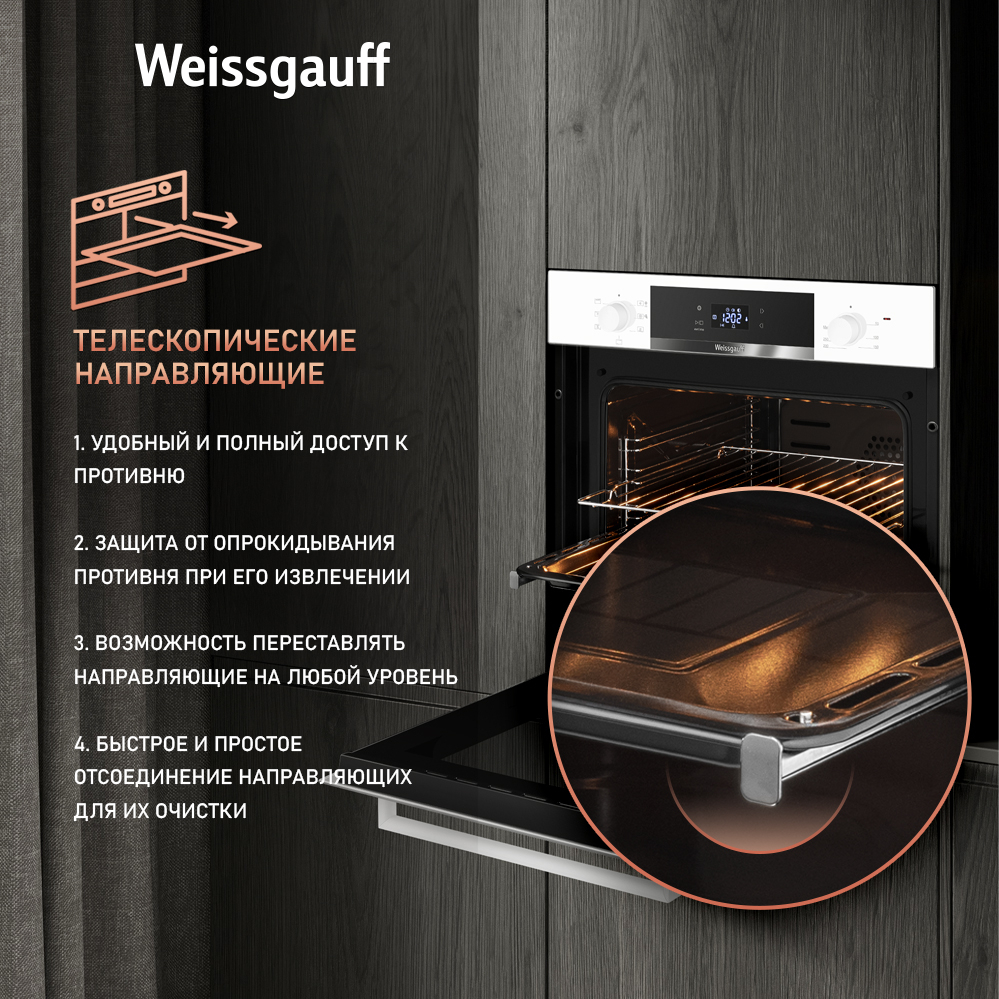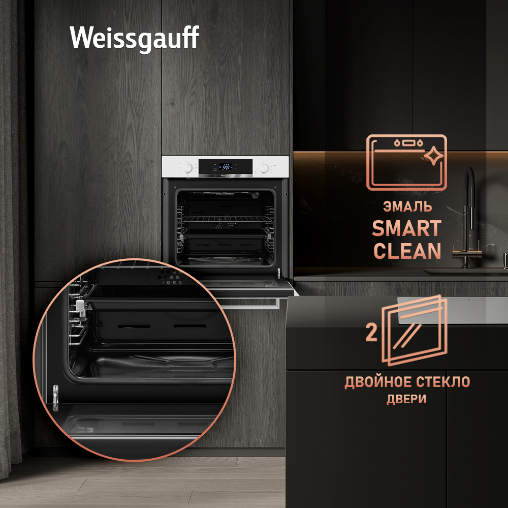 Новое поколение электрических духовых шкафов от Weissgauff предлагает модель, выполненную в белом цвете цвете. Управление, реализованное сочетанием чувствительного сенсорного блока и утапливаемых рукояток PIPO, дополняет богатый функционал, представленный сразу 7 режимами! А фантастический увеличенный объем XL 72 литра дополнит совершенство возможностей этого устройства! Благодаря всему этому вы сможете полностью управлять процессом приготовления пищи, добиваясь идеального результата каждый раз! Духовой шкаф Weissgauff станет не только отличным приобретением для вашей кухни, но и настоящим украшением интерьера, отражающим все благородство вашего вкуса и стиля!