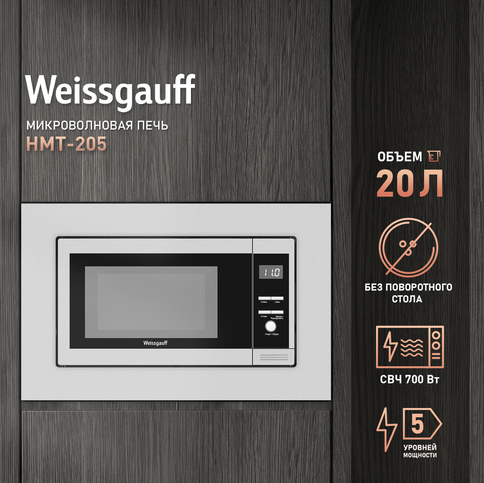 Встраиваемая микроволновая печь Weissgauff в цвете "нержавеющая сталь" равномерно разогревает еду без поворотного стола, благодаря системе Spiegel и биокерамическому покрытию White Flat Ceramic.