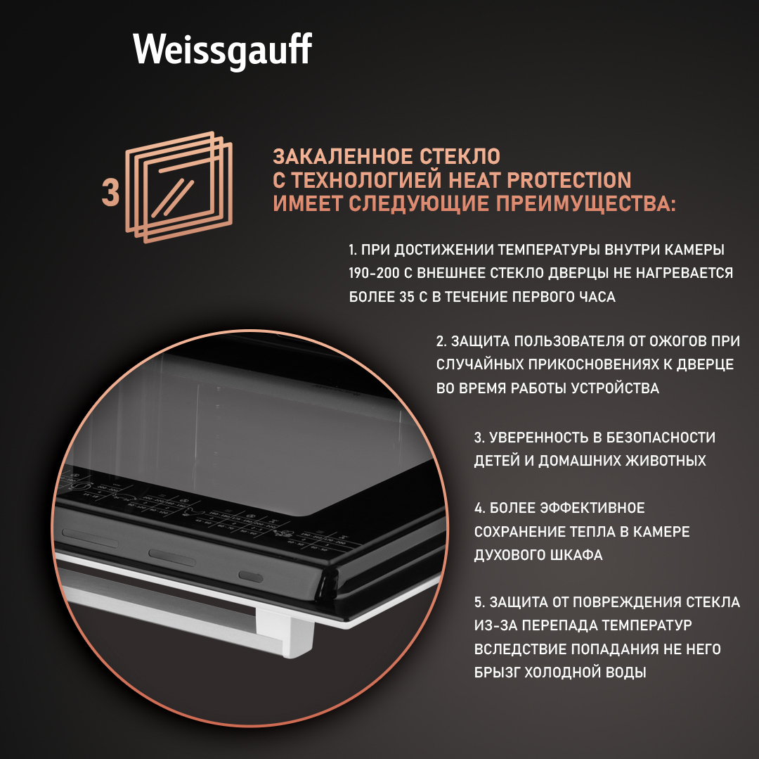 Тройное стекло дверцы с технологией защиты от нагрева Heat Protection, при которой во время достижения температуры внутри камеры 190-200 С внешнее стекло дверцы не нагревается более 35 С в течение первого часа. Эта технология воплощает в себе весь подход к безопасности и термозащите, который Weissgauff реализовали в данной модели. Такое стекло обеспечивает вам значительно большую степень защиты при случайных прикосновениях к нагревающейся дверце плиты, чем в моделях, не оснащенных технологией многослойного стекла. Для нас в Weissgauff важно, чтобы работа с бытовой техникой была не только приятной, но и безопасной!