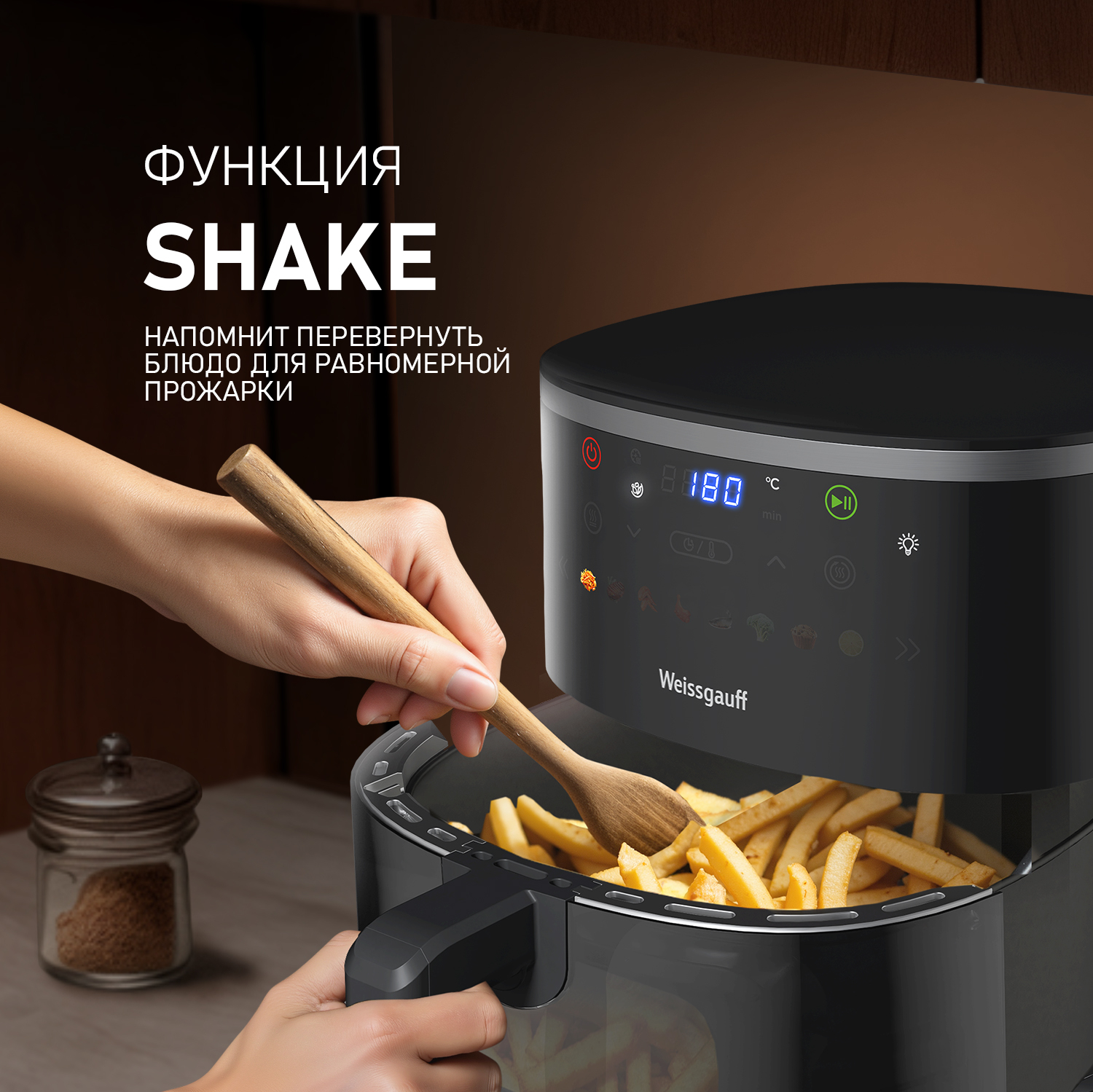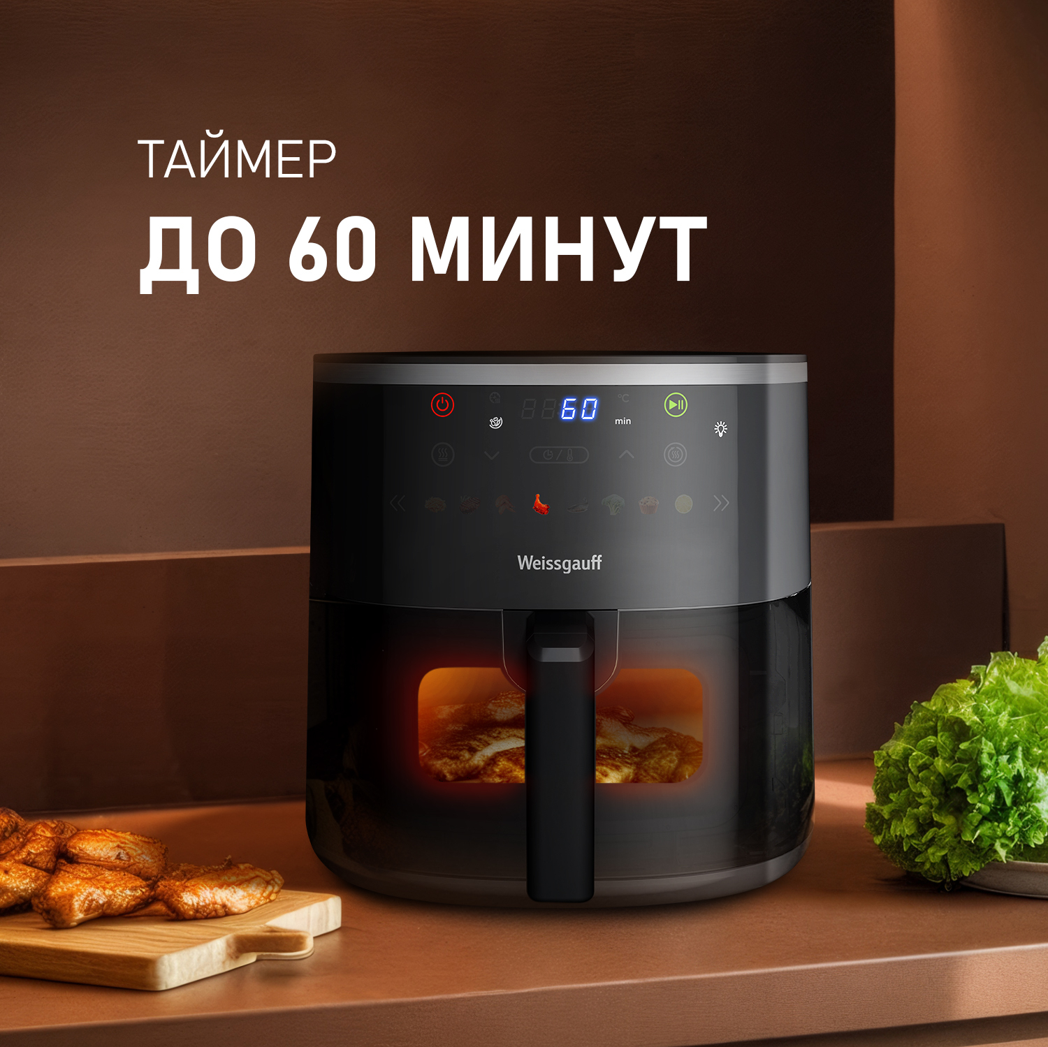 Аэрогриль от Weissgauff, является инновационным решением для вашей кухни. Этот многофункциональный прибор открывает новые горизонты в кулинарии, объединяя в себе несколько бытовых кухонных приборов. Благодаря современному и стильному дизайну, устройство станет украшением любой кухни, сочетая в себе элегантность и функциональность, компактные размеры, объём 6 литров и мощность 1750 Вт позволяют быстро и эффективно создавать огромное количество разнообразных блюд, а также экспериментировать и находить новые кулинарные рецепты. Наслаждайтесь вкусом любимых блюд без лишних калорий, ведь технология обжарки с использованием горячего воздуха сохраняет вкус и питательные свойства продуктов, а простота управления и наличие разнообразных программ превращают готовку в настоящее удовольствие!
