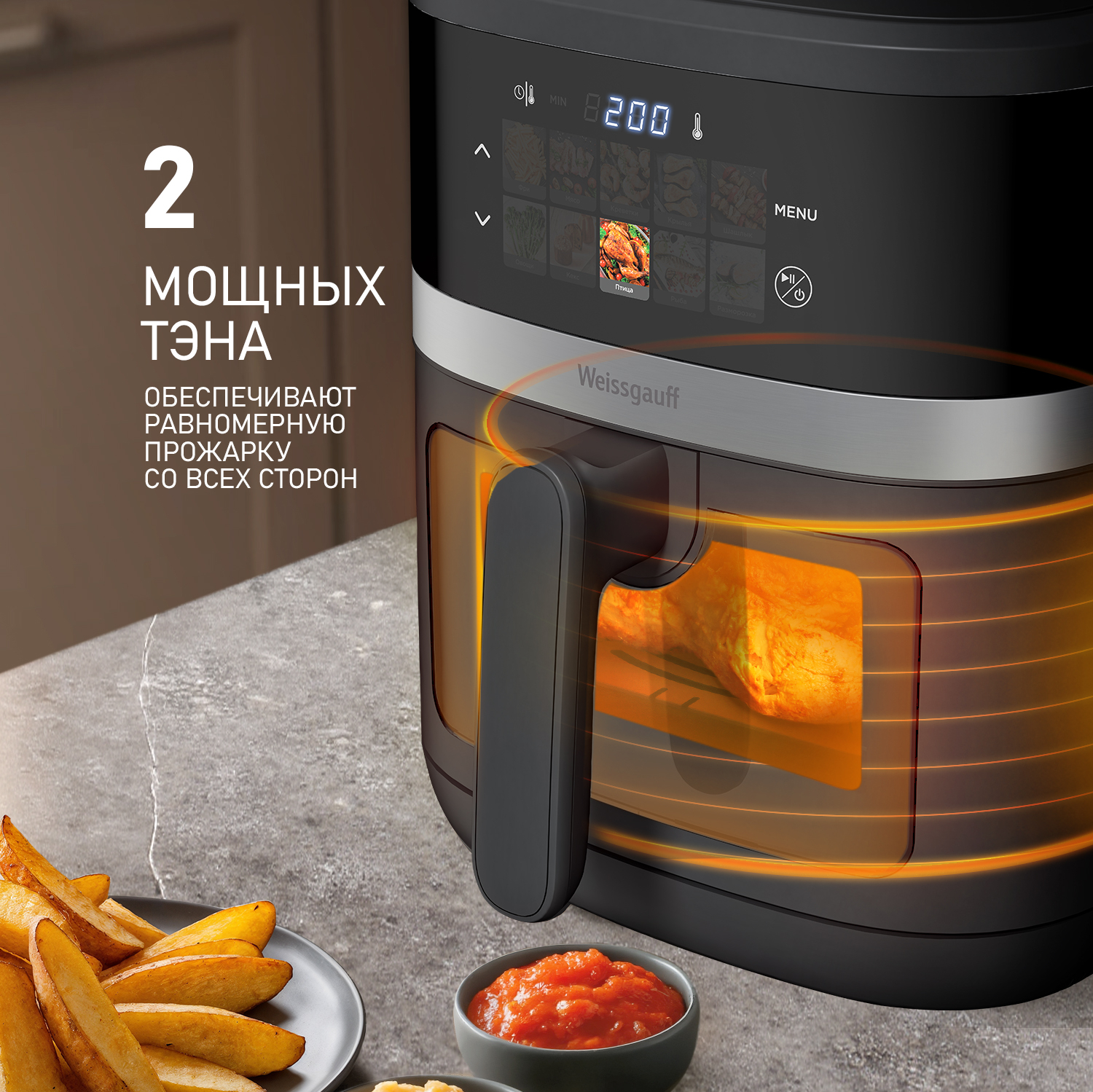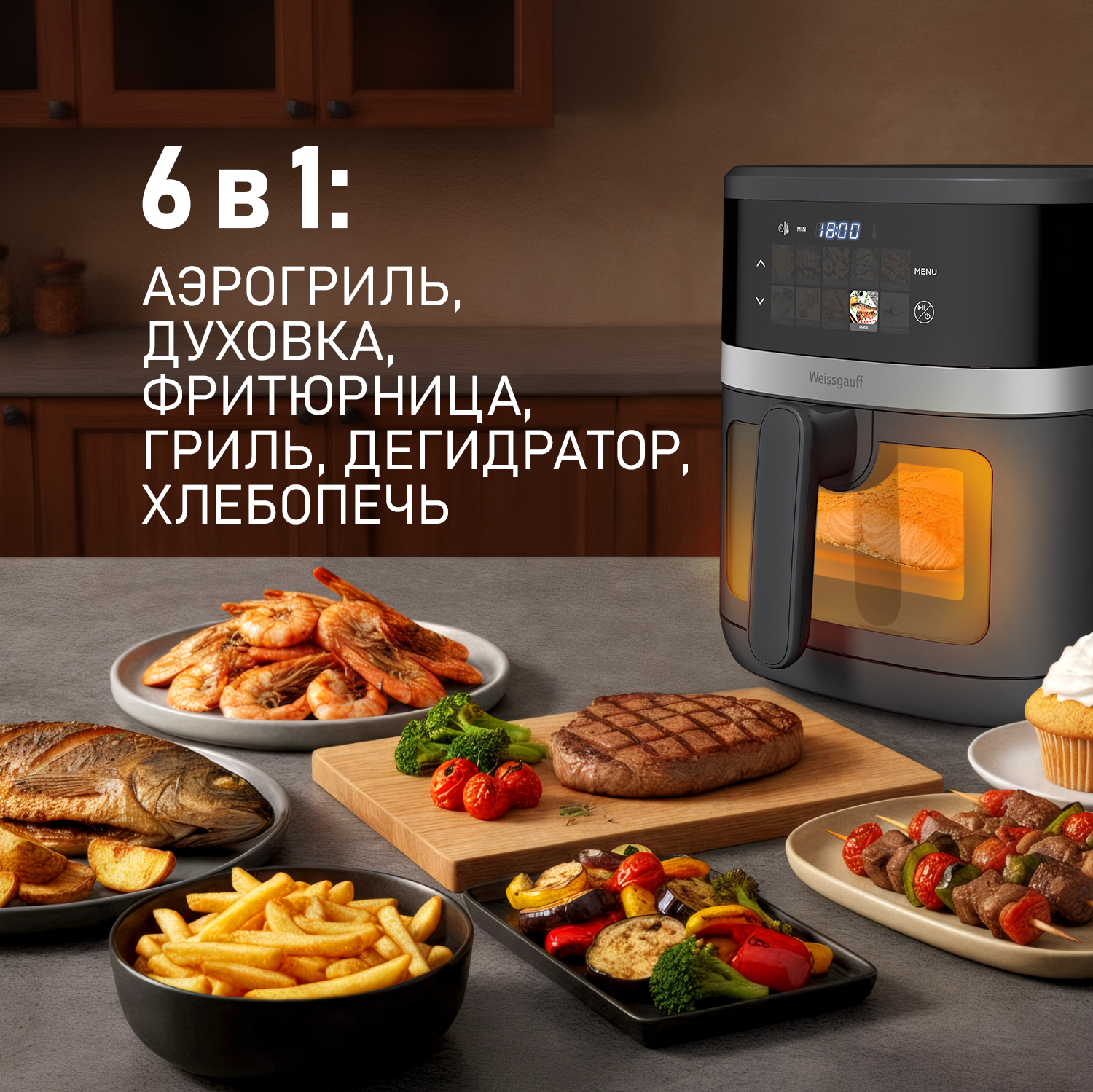 Аэрогриль от Weissgauff, является инновационным решением для вашей кухни. Этот многофункциональный прибор открывает новые горизонты в кулинарии, объединяя в себе несколько бытовых кухонных приборов. Благодаря современному и стильному дизайну, устройство станет украшением любой кухни, сочетая в себе элегантность и функциональность, компактные размеры, объём 7 литров и мощность 1700 Вт позволяют быстро и эффективно создавать огромное количество разнообразных блюд, а также экспериментировать и находить новые кулинарные рецепты. Наслаждайтесь вкусом любимых блюд без лишних калорий, ведь технология обжарки с использованием горячего воздуха сохраняет вкус и питательные свойства продуктов, а простота управления и наличие разнообразных программ превращают готовку в настоящее удовольствие!