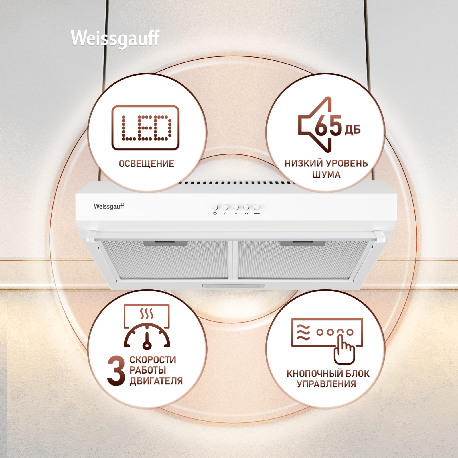 Низкий уровень шума 65 дБ сделает работу с данной вытяжкой по-настоящему комфортной и приятной, ведь мы в Weissgauff знаем, как добиться высокой производительности без лишнего шума!