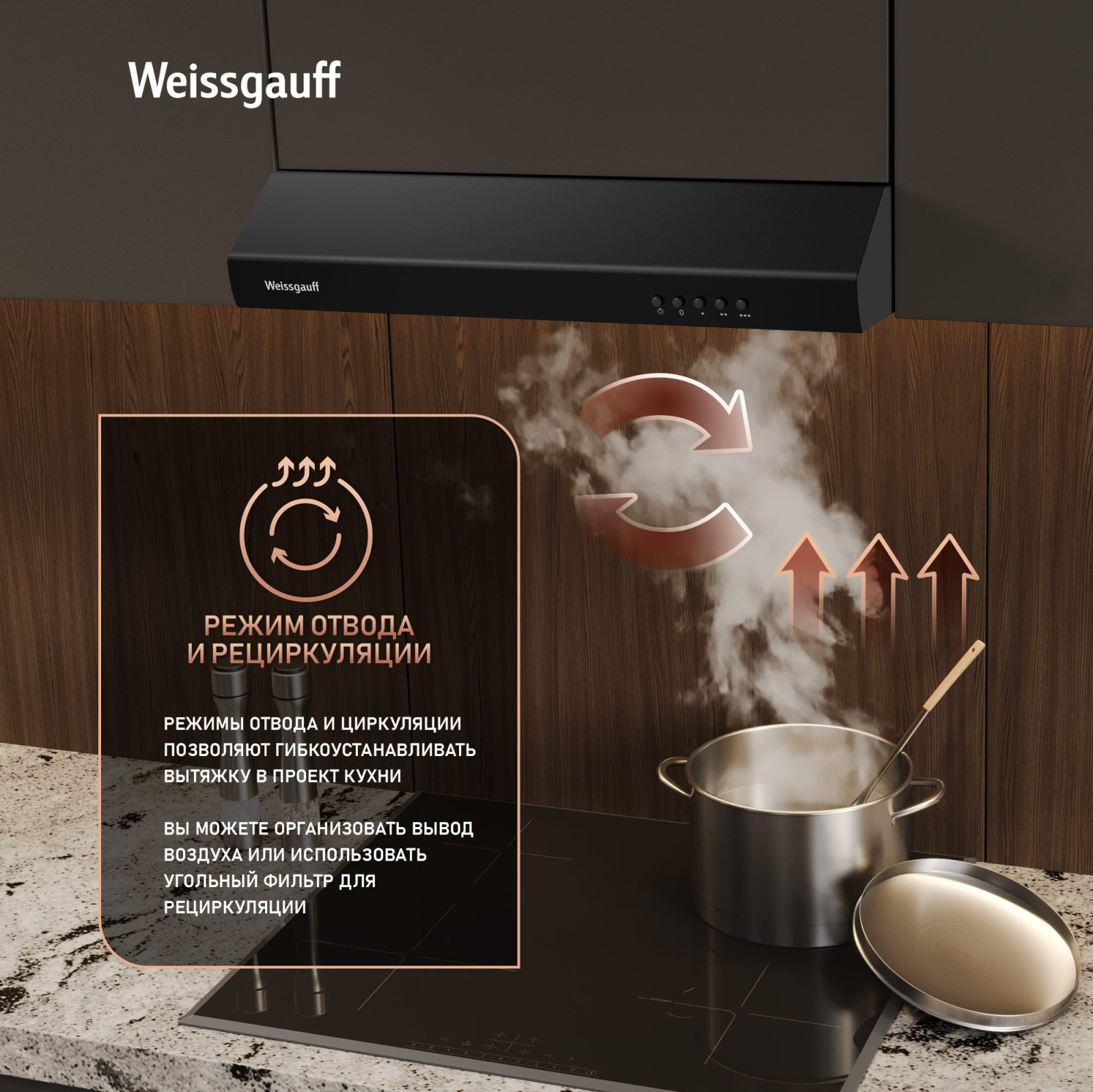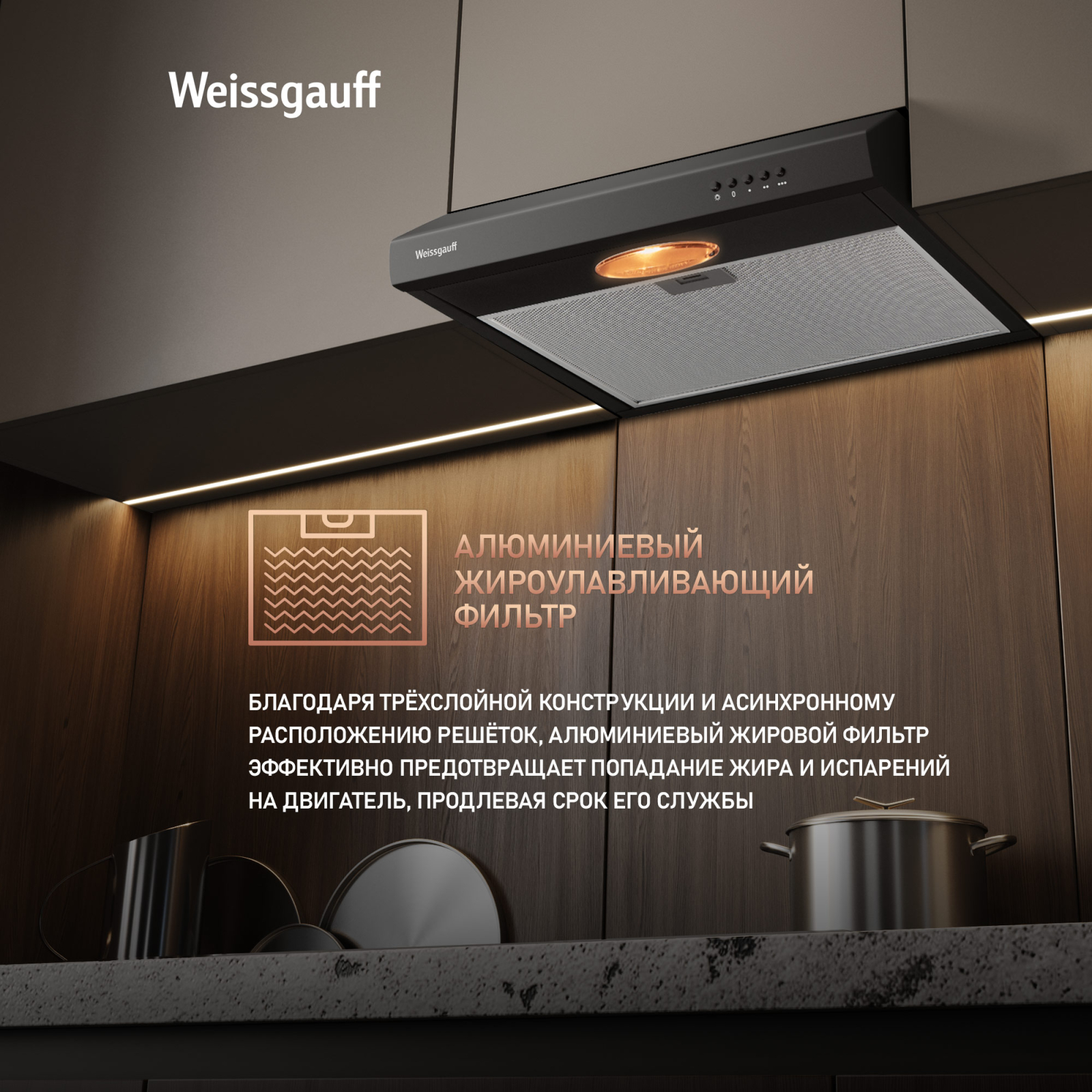 Плоская кухонная вытяжка от Weissgauff, воплощающая в себе безупречный дизайн и высокую эффективность, оснащена интуитивно понятным кнопочным управлением и выполнена в дизайне черного цвета!