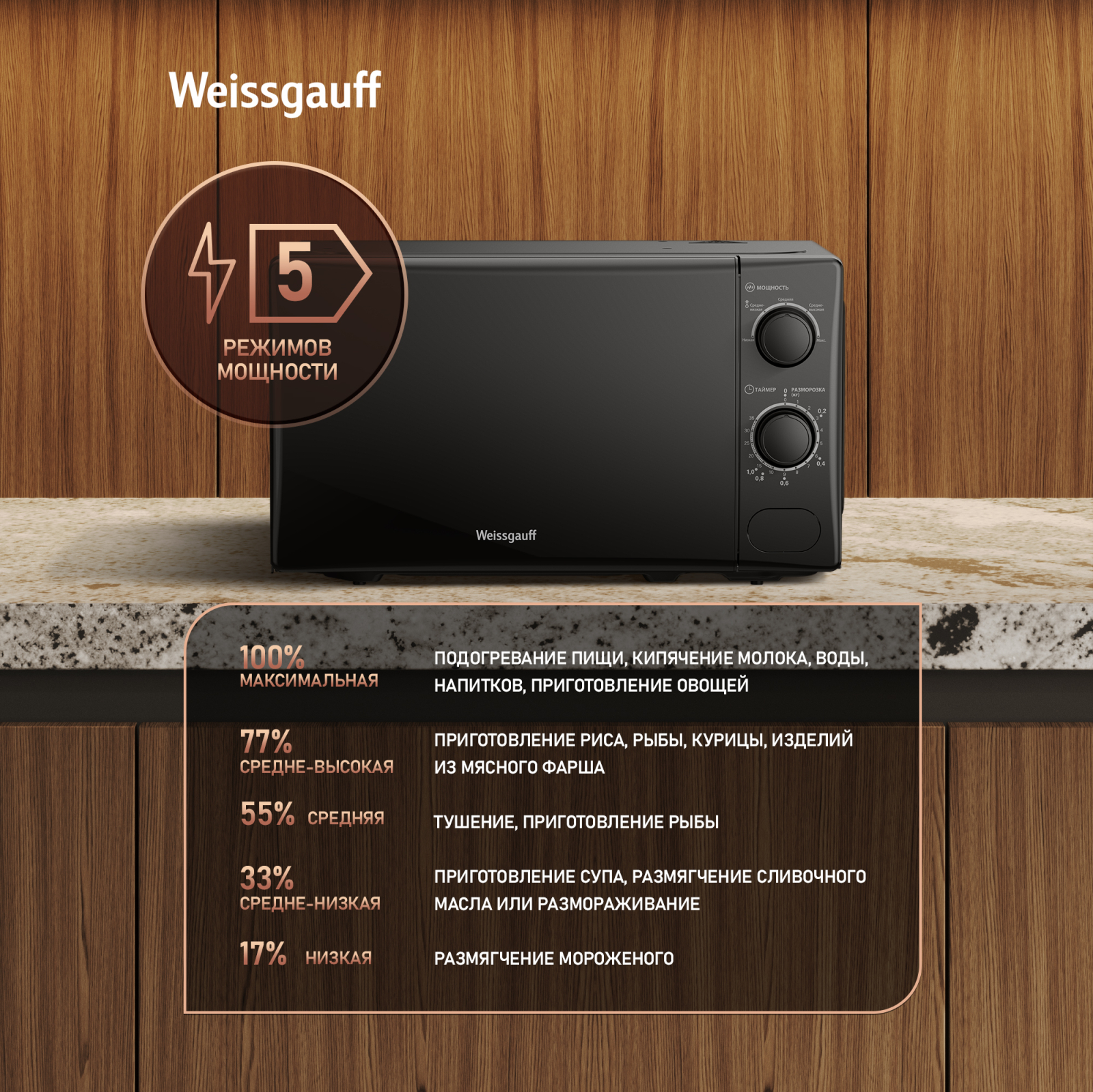 Дизайн, выполненный в черном цвете, станет финальным штрихом в совершенстве великолепного облика этой модели. Каждый раз, взаимодействуя с вашей микроволновой печью от Weissgauff, вы будете чувствовать, что это не только функциональное устройство, но и настоящее украшение вашей кухни!