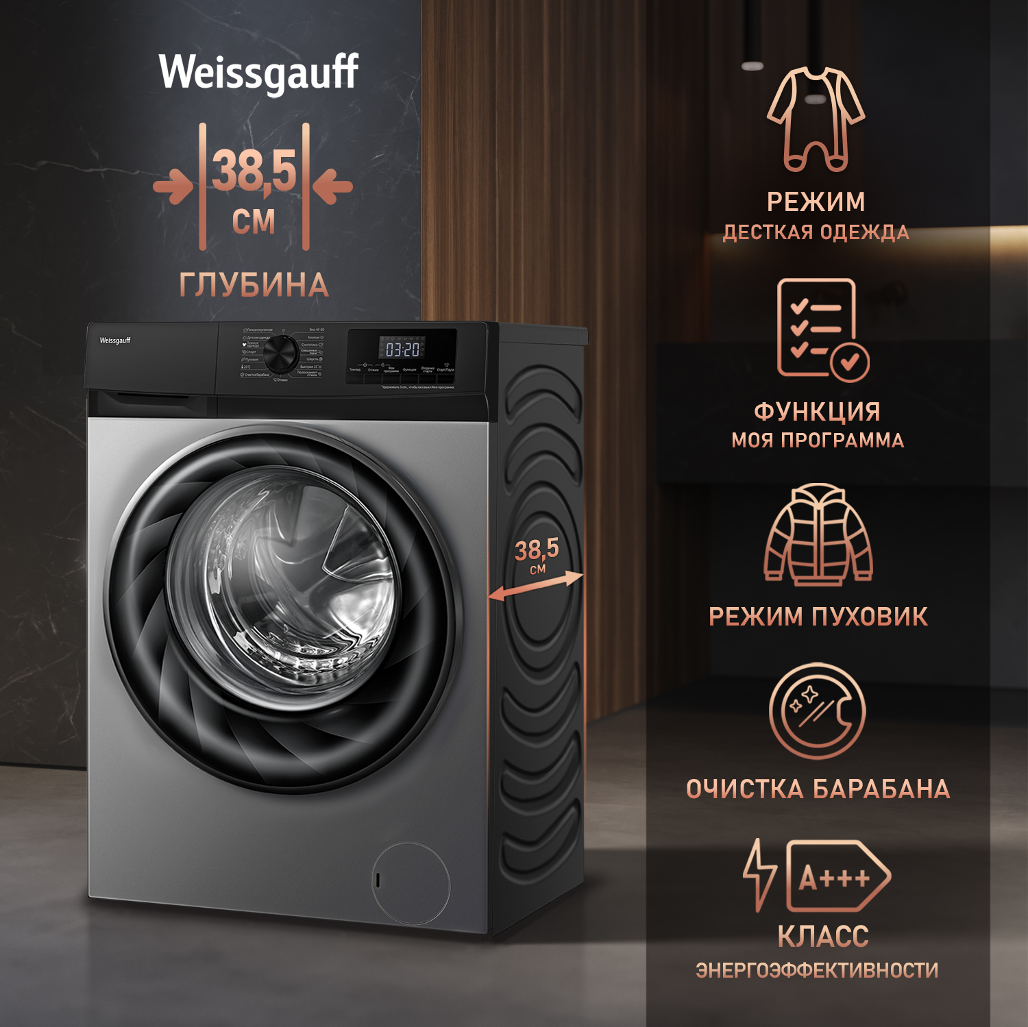 Глубина SuperSlim 38,5 см - мы в Weissgauff знаем, как важна в стиральной машине не только функциональность, но и компактность. Глубина этой модели позволит с легкостью разместить её даже в самой небольшой квартире!