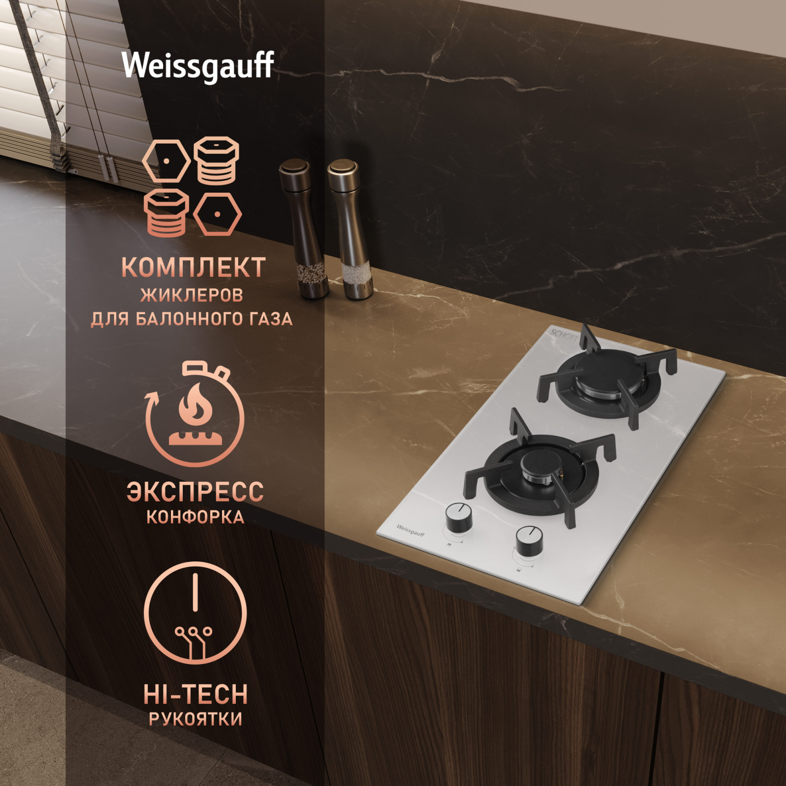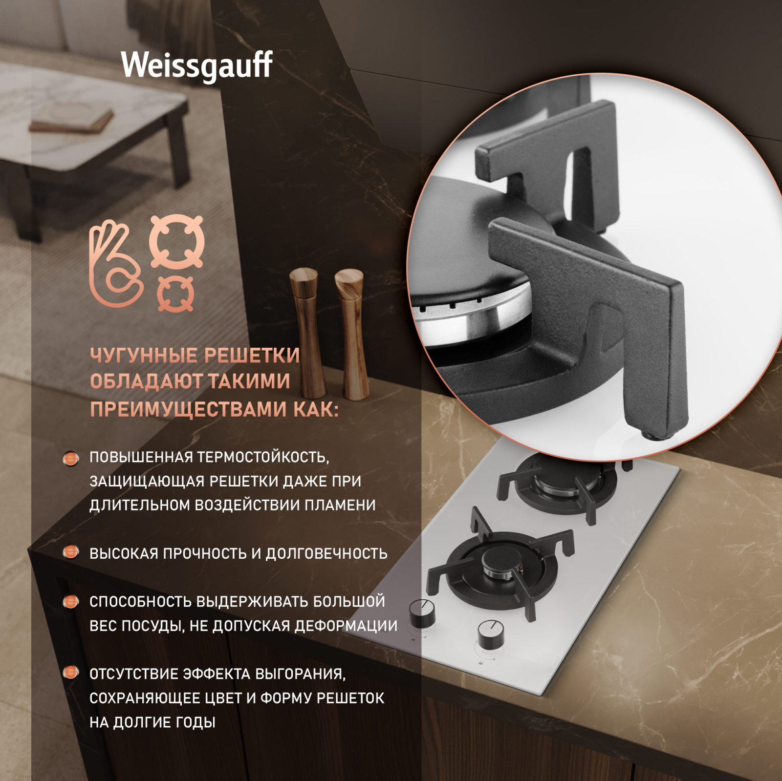 Решетки из высококачественного чугуна это неизменное качество, надежность и долговечность, воплощенные в каждой детали! А особая элегантность их дизайна не только послужит отличным дополнением к общему стилю варочной панели, но и существенно облегчит очистку и уход за ней. А благодаря особому вниманию Weissgauff к каждой детали, вы еще не раз оцените устойчивость и эргономичность этих решеток!