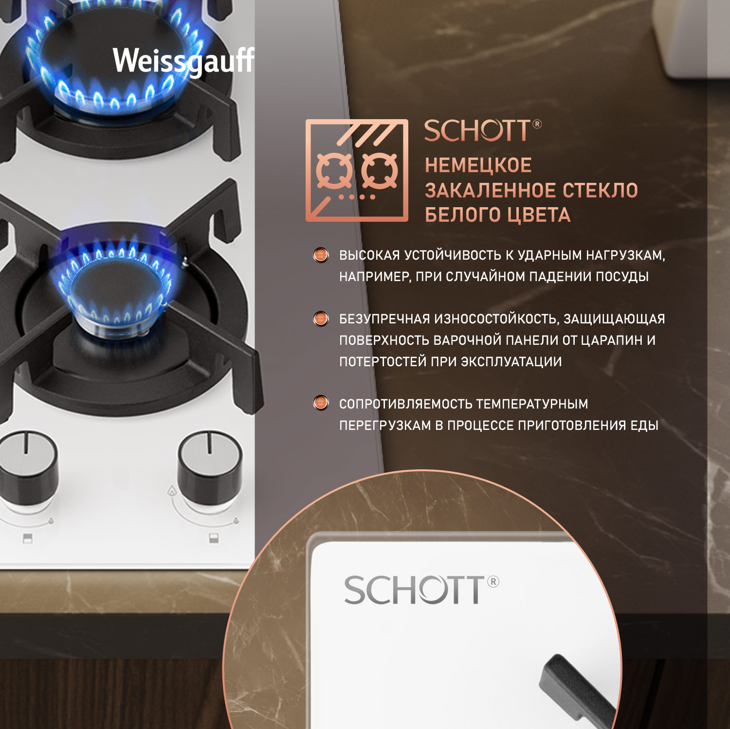 Белое закаленное стекло не только роскошно выглядит, подчеркивая великолепный внешний вид данной модели, но и отлично справляется с механическими воздействиями и температурными перегрузками