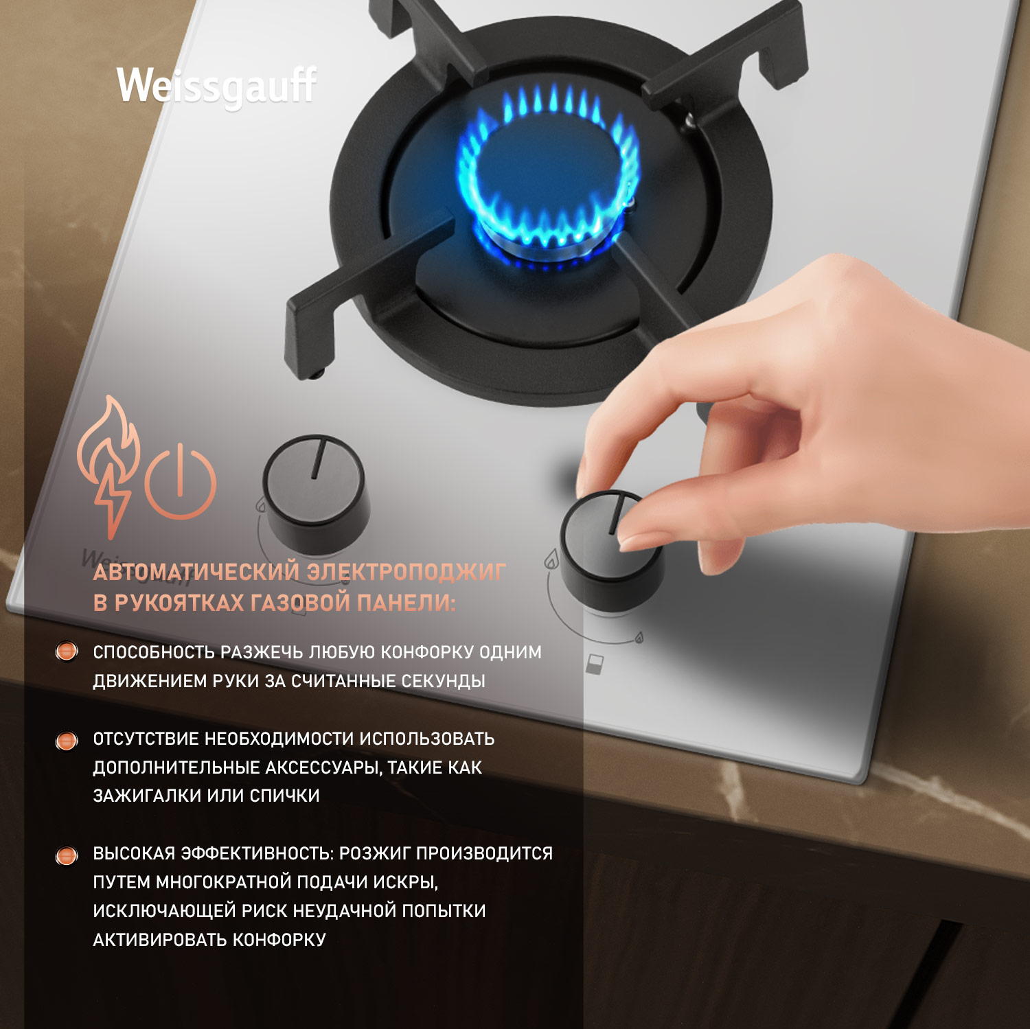 Автоматический электроподжиг, независимо встроенный в каждую из рукояток, позволит зажечь любую конфорку за долю секунды, всего одним нажатием и поворотом руки, не прибегая к дополнительным приспособлениям