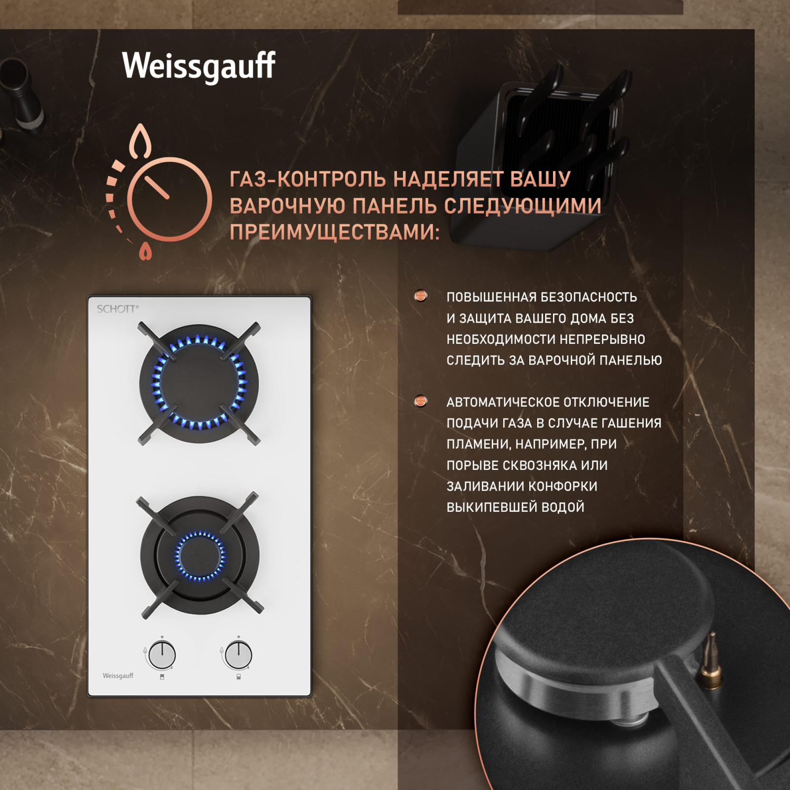 Газ-контроль каждой конфорки обеспечивает наивысшую безопасность: в случае, если пламя погасло, подача газа будет автоматически прекращена