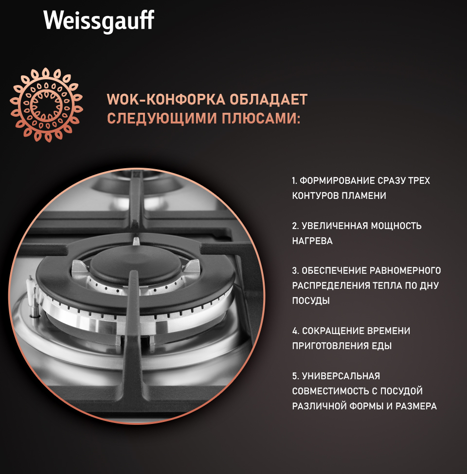 Новое поколение встраиваемых независимых газовых панелей Weissgauff представляет модель шириной 60 см, оснащенную 4 эффективными конфорками (в том числе и WOK-конфорку с трехконтурным пламенем), решетками из высококачественного чугуна, функцией автоматического электроподжига и системой безопасности "газ-контроль". Дизайн, исполненный в нержавеющей стали, дополнит безупречный облик модели, сделав её не только практичным решением для приготовления любого блюда, но и настоящей жемчужиной в интерьере вашей кухни!