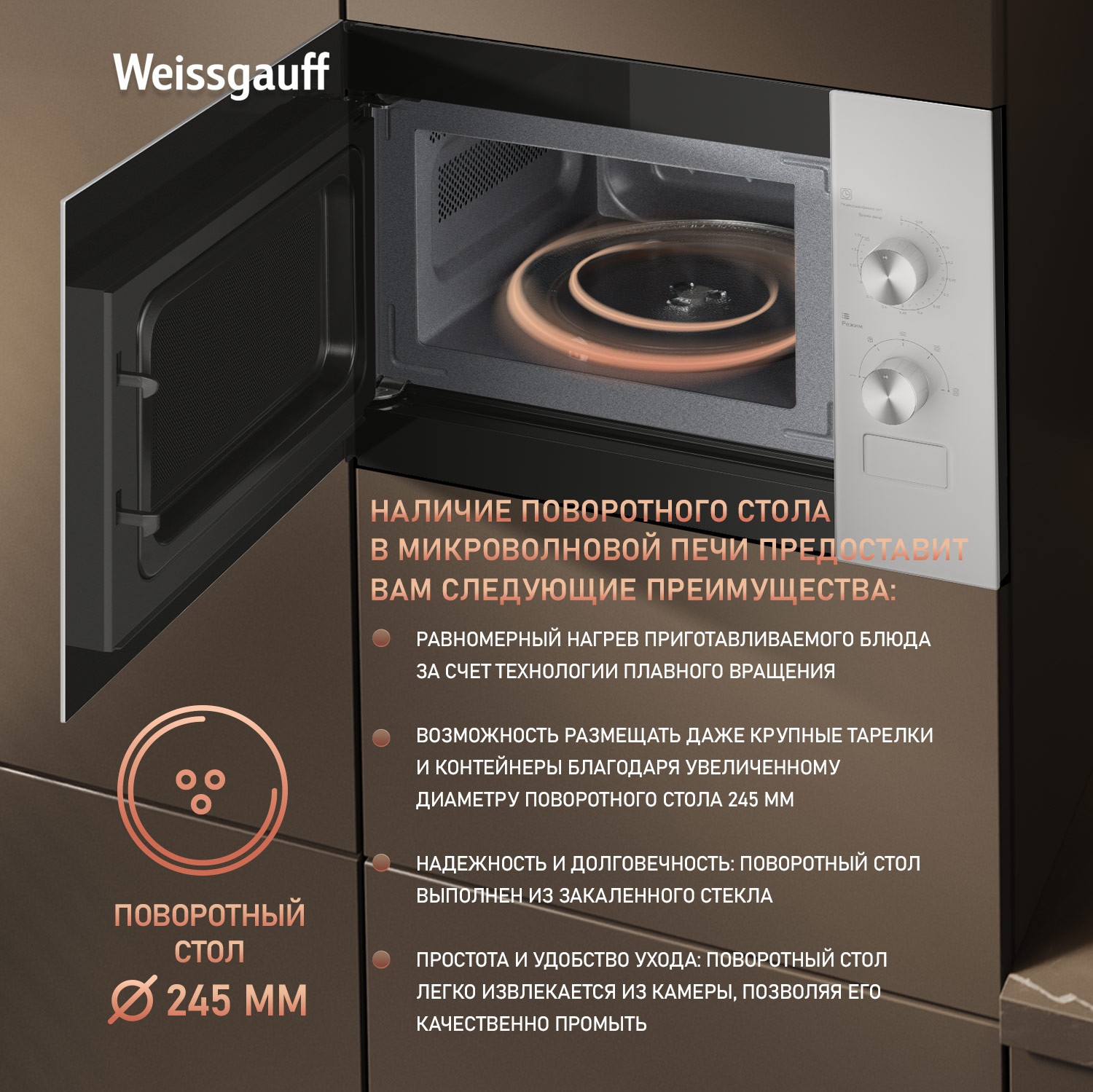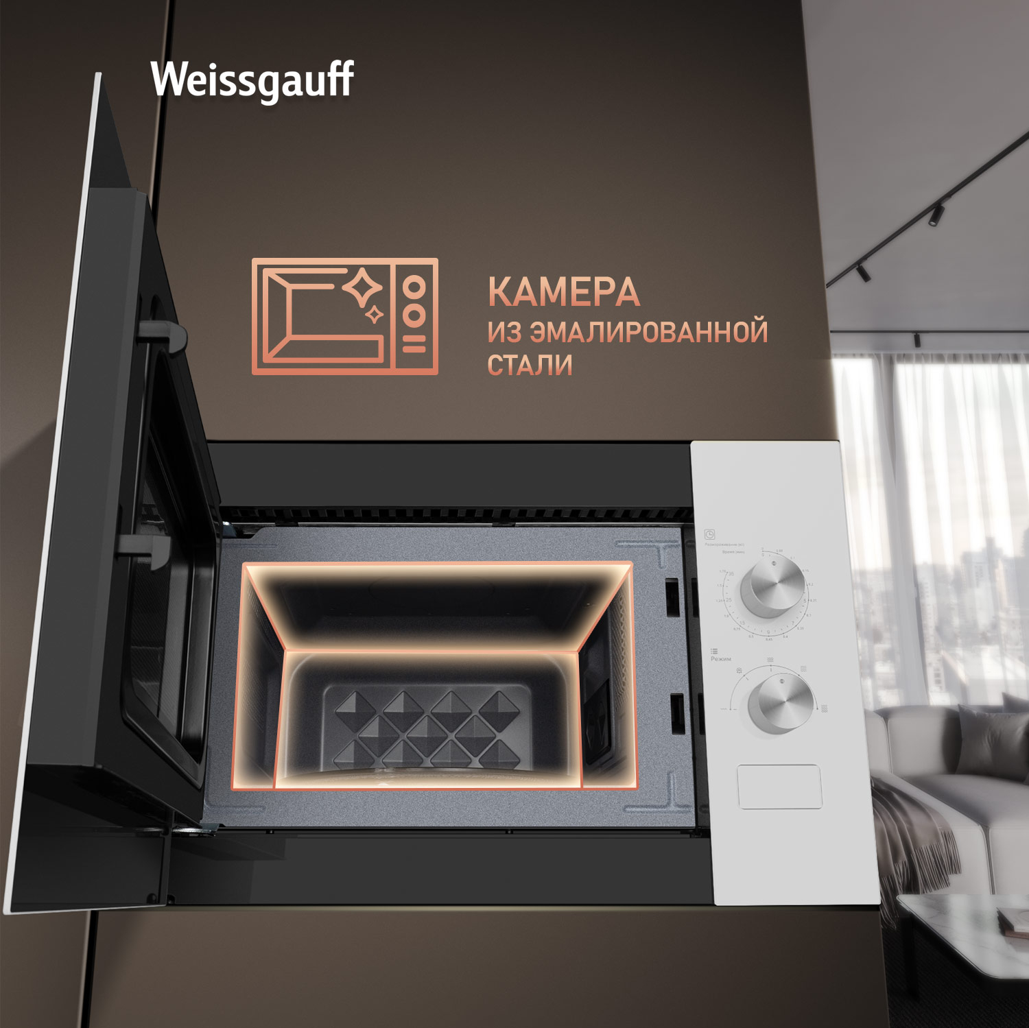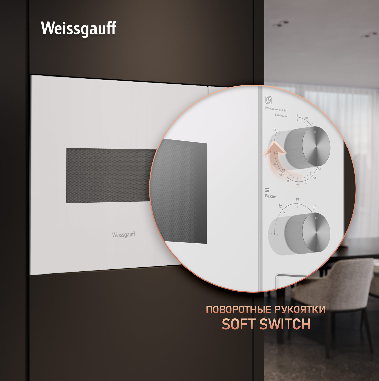Встраиваемая микроволновая печь Weissgauff шириной 45 сантиметров, выполненная в белом закаленном стекле, оснащённая механическими поворотными рукоятками Soft Switch, имеющая объем 20 литров - это настоящее воплощение о