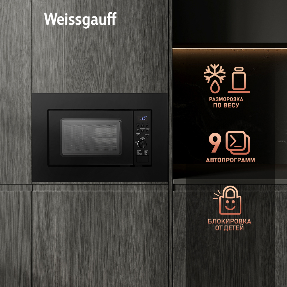 Встраиваемая микроволновая печь Weissgauff с объемом 20 литров, выполненная в черном цвете, равномерно разогревает еду при помощи поворотного стола, а также оснащена грилем с возможностью работы в комбинированном режиме и набором программ автоменю!