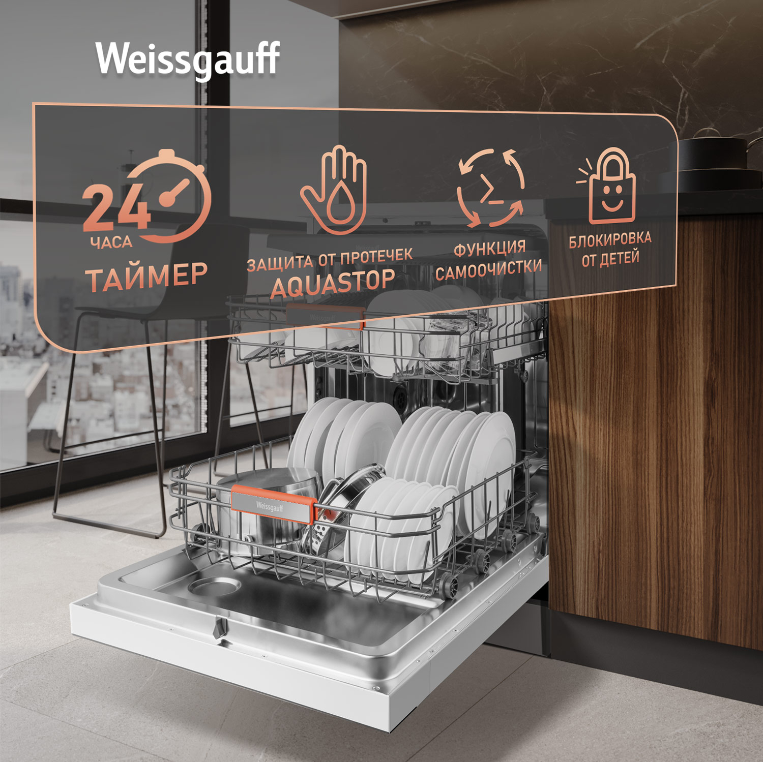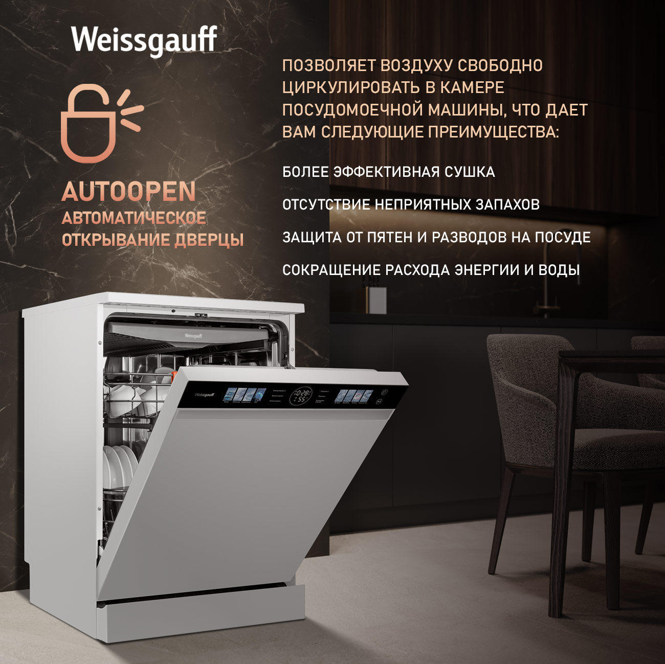 Полноразмерная отдельностоящая посудомоечная машина Weissgauff с автоматическим открыванием дверцы по завершении цикла, тремя корзинами и вместимостью посуды до 14 комплектов, а также инновационный цветной дисплей SMART SCREEN с сенсорным управлением делают данную модель не только эффективной, но и по-настоящему удобной в работе! Это одна из наиболее передовых моделей 2025 года среди посудомоечных машин Weissgauff!
