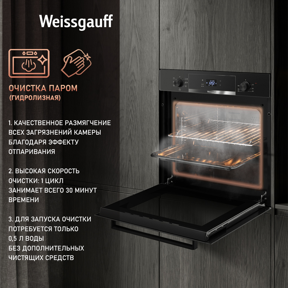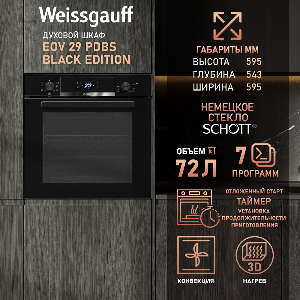 Новое поколение электрических духовых шкафов от Weissgauff предлагает модель, выполненную в черном цвете в дизайне BLACK EDITION. Управление, реализованное сочетанием чувствительного сенсорного блока и утапливаемых черных рукояток PIPO, дополняет богатый функционал, представленный сразу 7 режимами! А фантастический увеличенный объем XL 72 литра дополнит совершенство возможностей этого устройства! Благодаря всему этому вы сможете полностью управлять процессом приготовления пищи, добиваясь идеального результата каждый раз! Духовой шкаф Weissgauff станет не только отличным приобретением для вашей кухни, но и настоящим украшением интерьера, отражающим все благородство вашего вкуса и стиля!