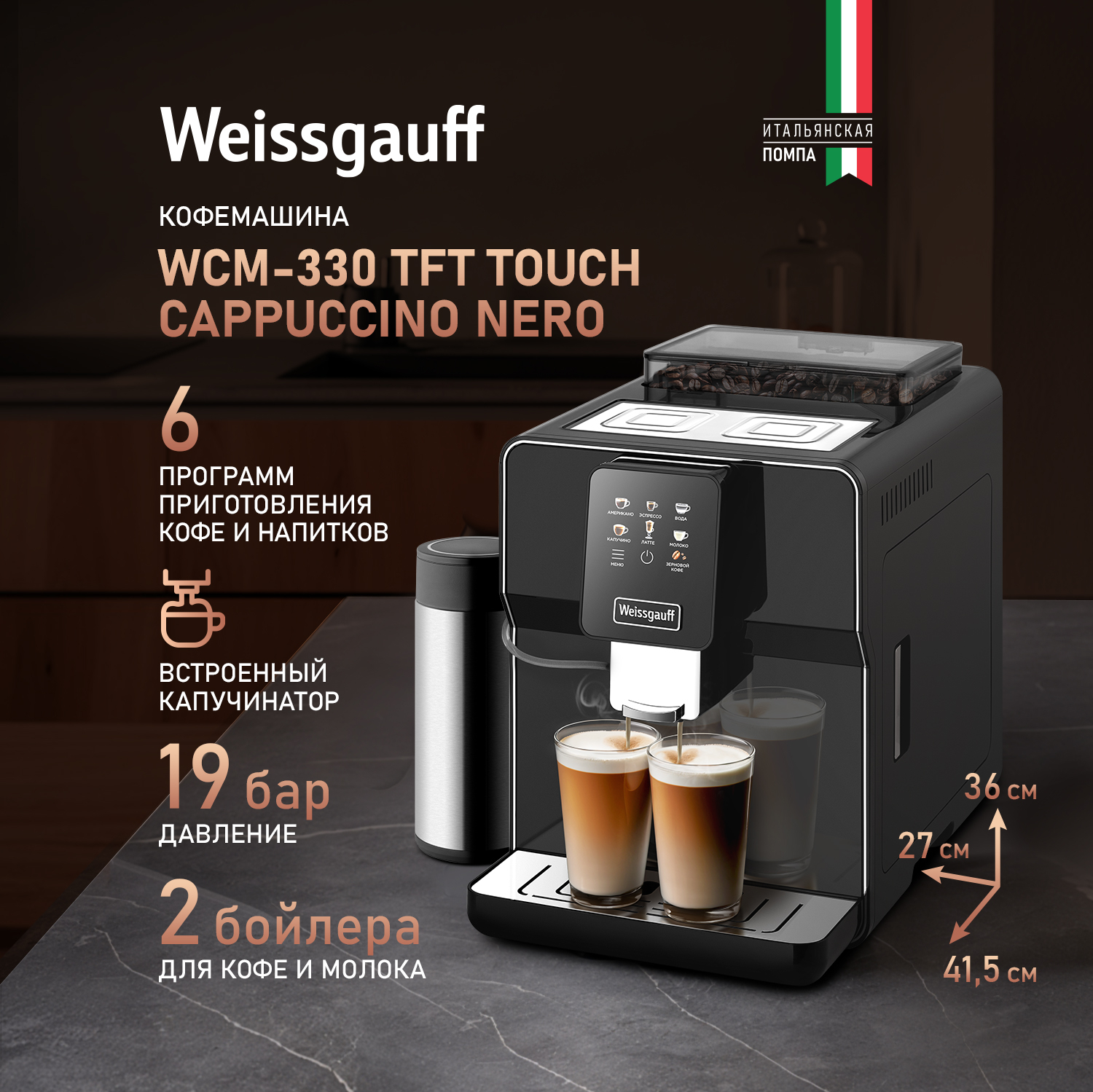 Кофемашина от Weissgauff, выполненная в черном цвете, оснащенная вместительным контейнером для зерен на 370 грамм, обладающая цветным сенсорным дисплеем, системой подачи молока с автоматическим капучинатором, внешней емкостью для молока, а также 6 заранее предустановленными программами для приготовления ароматного вкуснейшего кофе прямо на вашей кухне!