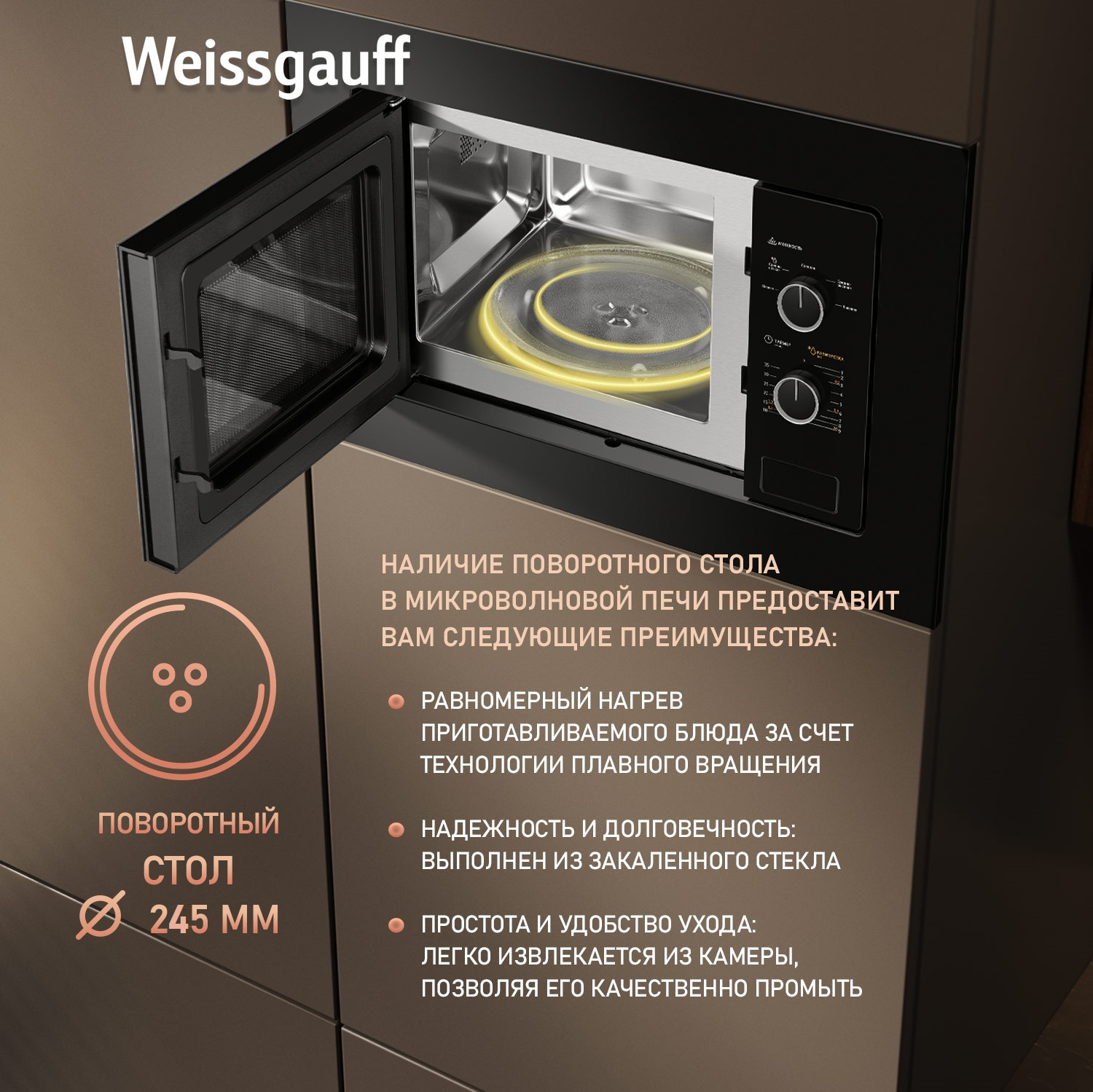 Поворотный стол диаметром 245 мм не только обеспечивает равномерный прогрев блюда со всех сторон, но и удобно извлекается из камеры, делая легкими его очистку и уход