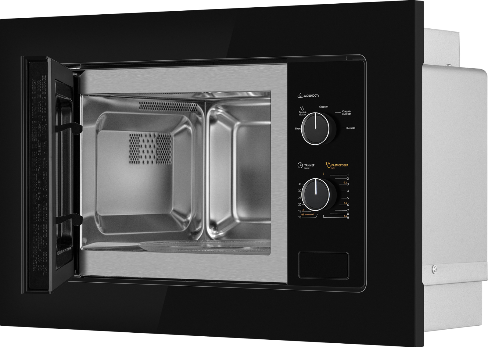 Встраиваемая микроволновая печь Weissgauff с объемом 20 литров, выполненная в черном цвете, оснащённая механическими поворотными рукоятками Soft Switch, равномерно разогревает еду при помощи поворотного стола!