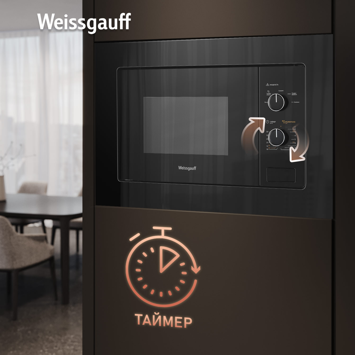 Встраиваемая микроволновая печь Weissgauff с объемом 20 литров, выполненная в черном цвете, оснащённая механическими поворотными рукоятками Soft Switch, равномерно разогревает еду при помощи поворотного стола!
